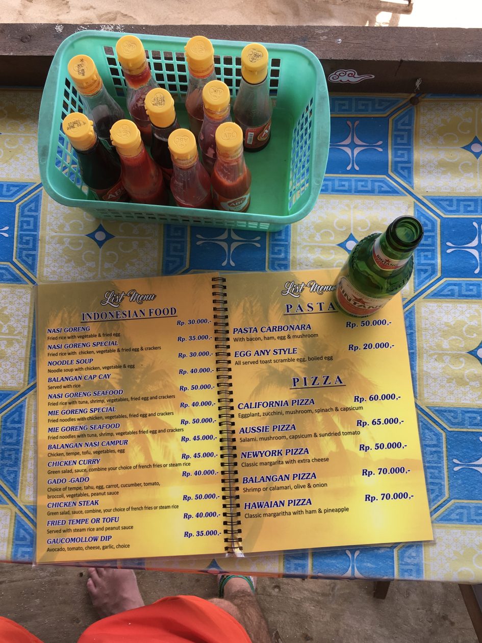 Bij Ossy hebben we het lekkerst gegeten. Ossy zit tussen het Sunset Cafe en Santai Warung. Het Sunset Cafe verhuurt kamers voor 250.000 per nacht. Bel 081934340825. Een