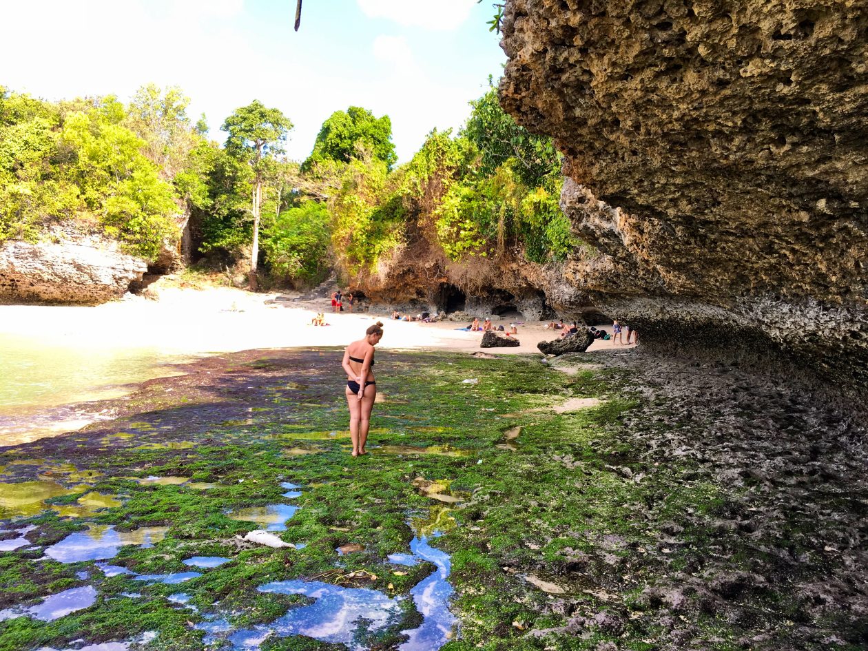 Dit is een heel erg relaxed strand en het wordt mooier als het eb wordt. Kom dan even met je luie kont van je strandbed af en loop helemaal naar links (vanaf je strandbed gezien). Prachtige overhangende rotsen zijn nu bloot komen te liggen en je kan de metershoge golven, die hier opkrullen, bijna aanraken.