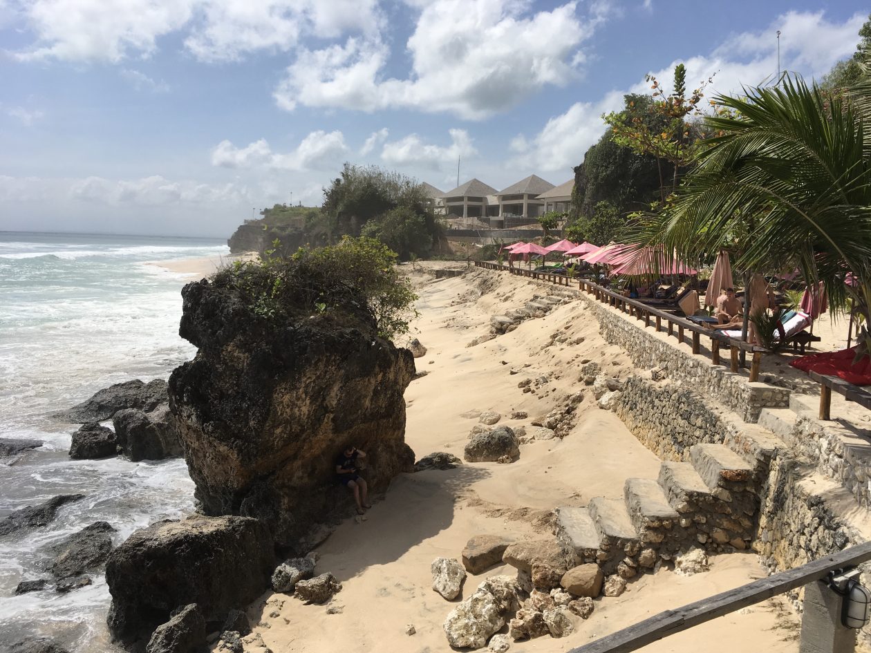een heel hip sfeervol surf hotel tegen de rotsen aan gebouwd en direct aan het strand op Bali