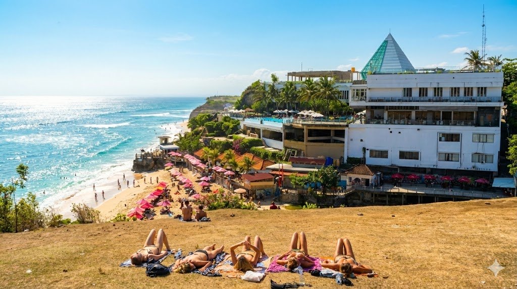 een heel hip sfeervol surf hotel tegen de rotsen aan gebouwd en direct aan het strand op Bali
