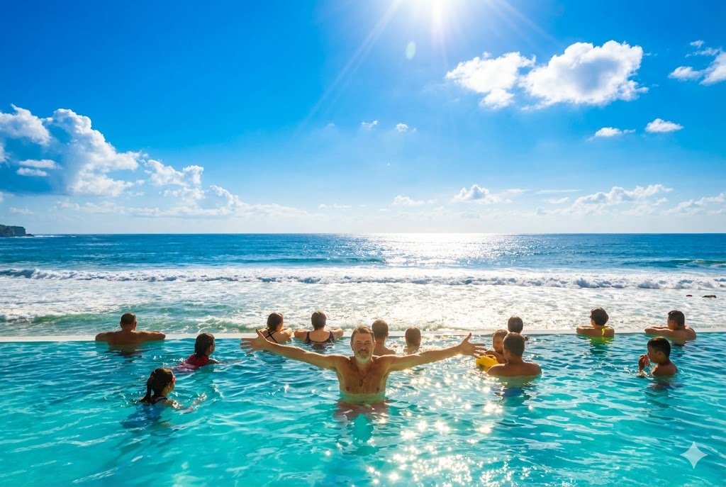 Hier hebben we alleen wat gedronken en clandestien van het uitzicht genoten in de infinity pool van het Klapa Hotel. Een hilarisch hotel dat me meteen aan de film Lost in Translation deed denken. Afijn, je had erbij moeten zijn.