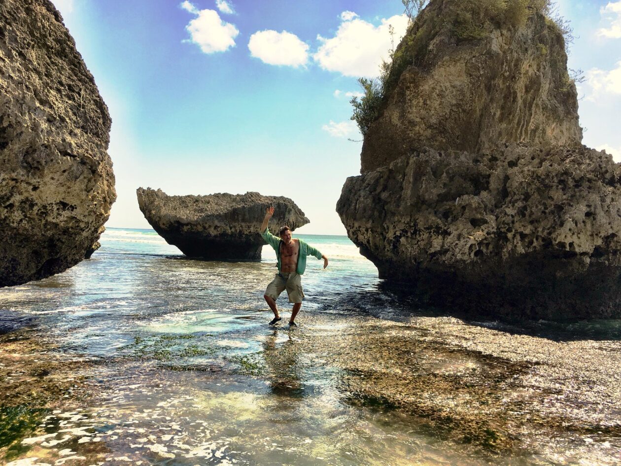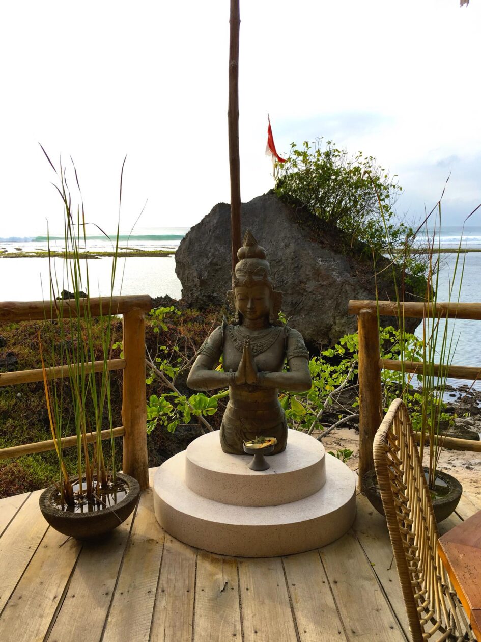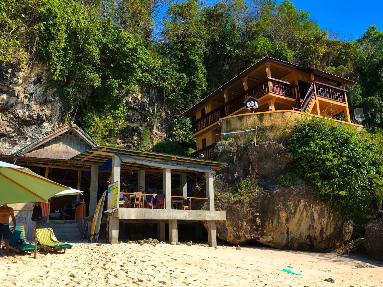 Wow! Wat een toffe plek. Dreamsea Bali Surfhotel & Restaurant zit als een zwaluwnestje tegen de rotsen van Padang Padang Beach aangeplakt. Bij eb slenter je er zigzaggend tussen de rotsen zo naartoe. Je kunt ook via de hoofdweg, maar dat is minder mooi.
