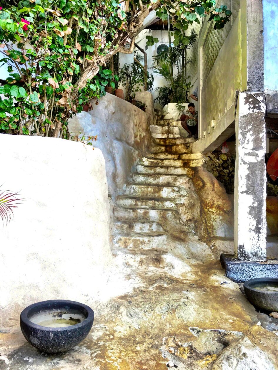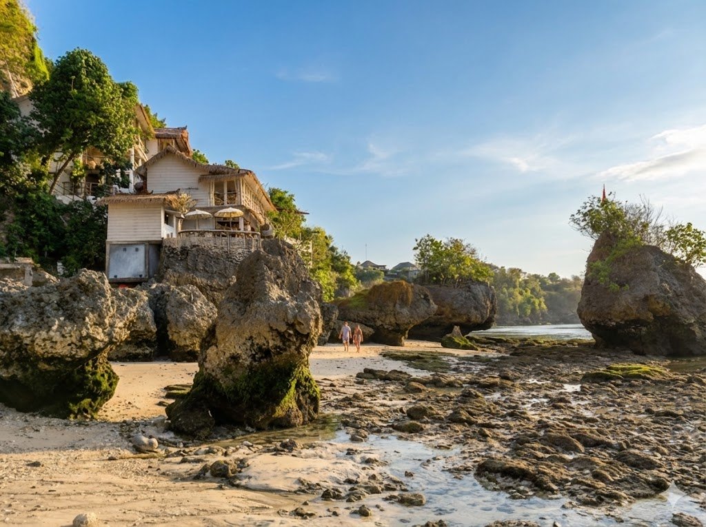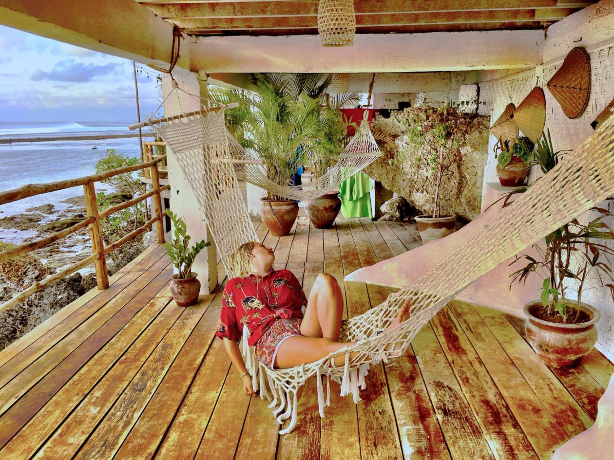 Wow! Wat een toffe plek. Dreamsea Bali Surfhotel & Restaurant zit als een zwaluwnestje tegen de rotsen van Padang Padang Beach aangeplakt. Bij eb slenter je er zigzaggend tussen de rotsen zo naartoe. Je kunt ook via de hoofdweg, maar dat is minder mooi.