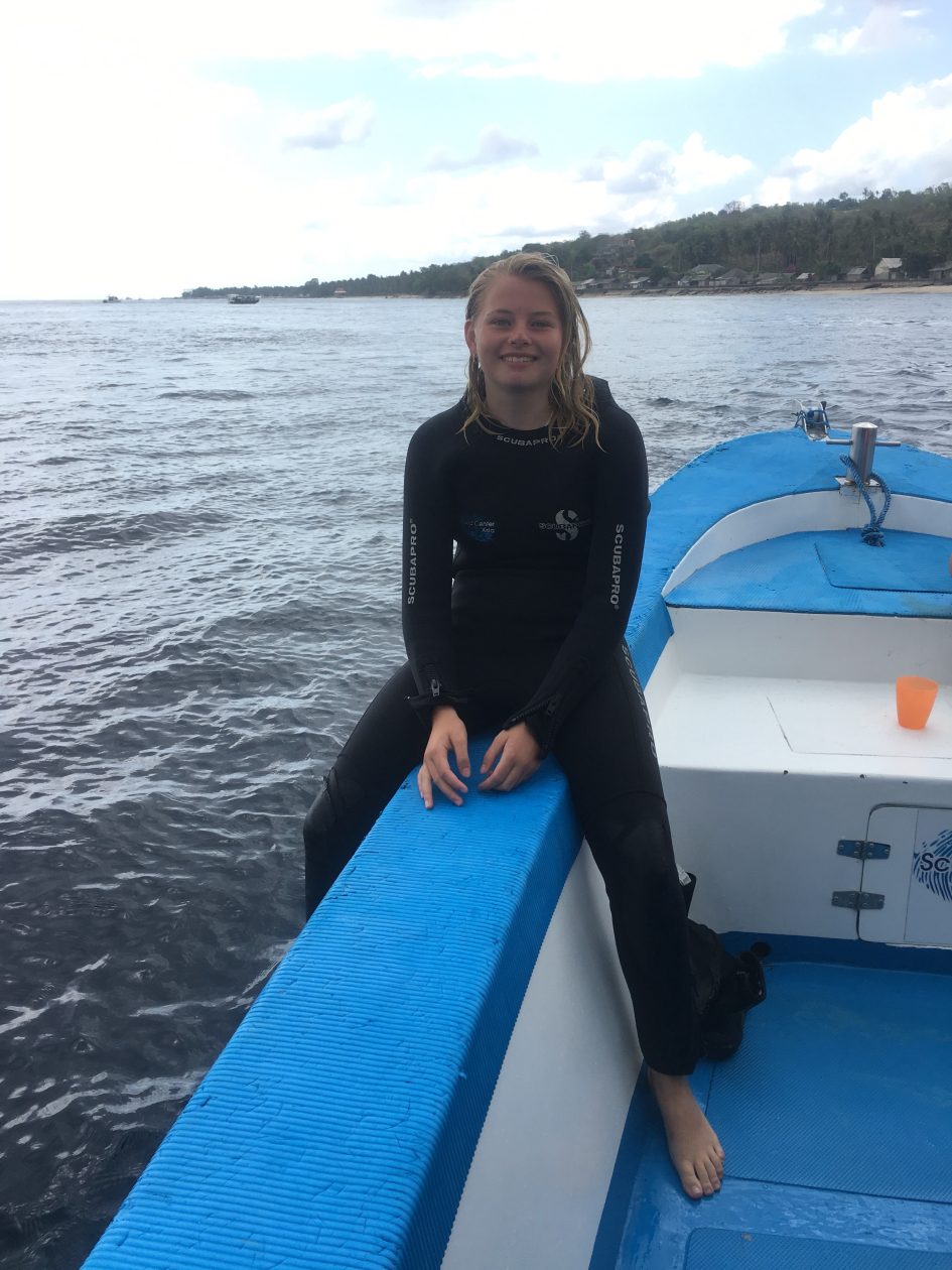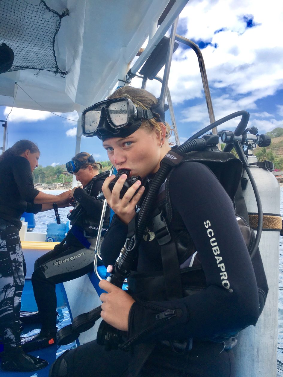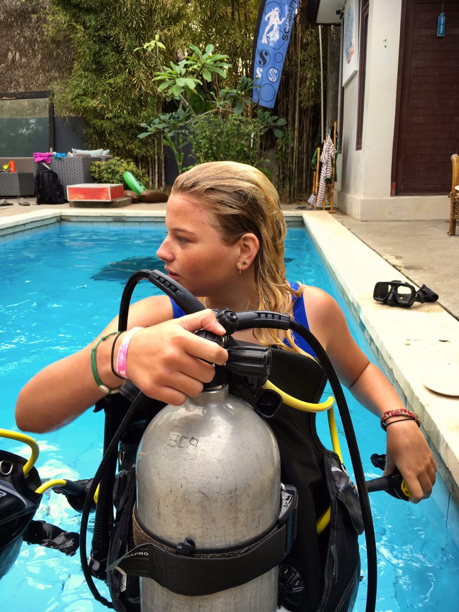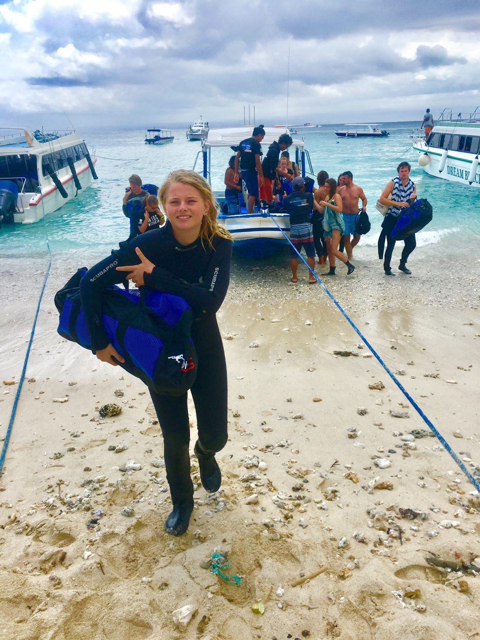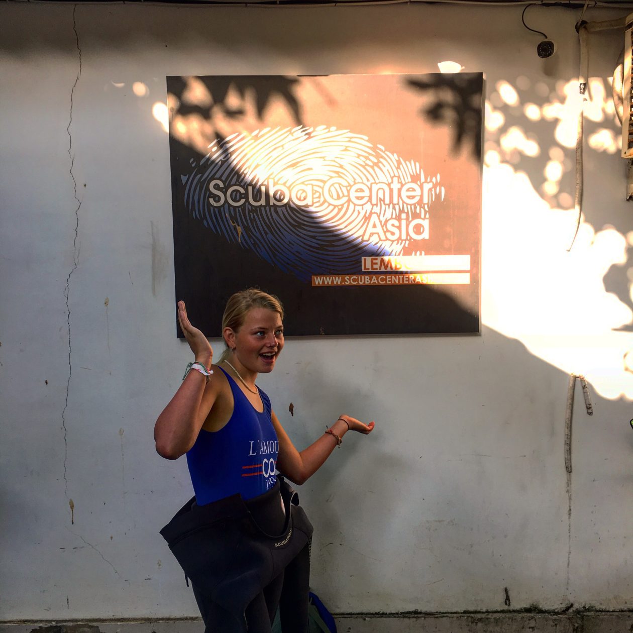 Vandaag heeft dochter Jools haar eerste duik in open water gemaakt. Vriendin Melanie werkt bij Scuba Center Asia op Mushroom Beach (Nusa Lembongan), dus dat voelde lekker vertrouwd. Voor ons is het twintig jaar geleden dat we voor het laatst doken. Ik zou liegen als ik zou zeggen dat ik geheel onbevreesd achterstevoren het water in lazerde.