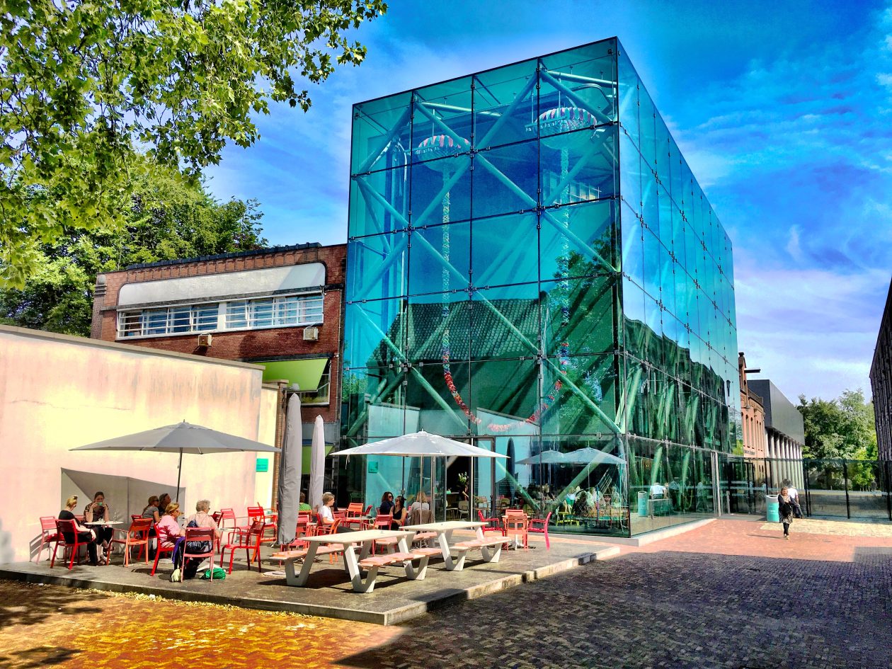 Op de fiets verken je een stad altijd het makkelijkst, vind ik. De zon scheen en een lichte bries maakte het aangenaam om op ons gemak door de stad te cruisen. Tilburg was vroeger de textielhoofdstad van Nederland en de grootste werkgever in de regio. Tegen de oude fabriek waar het TextielMuseum in zit, heeft de architect een glazen entree geplaatst. Dat is goed gelukt, het ziet er top uit.