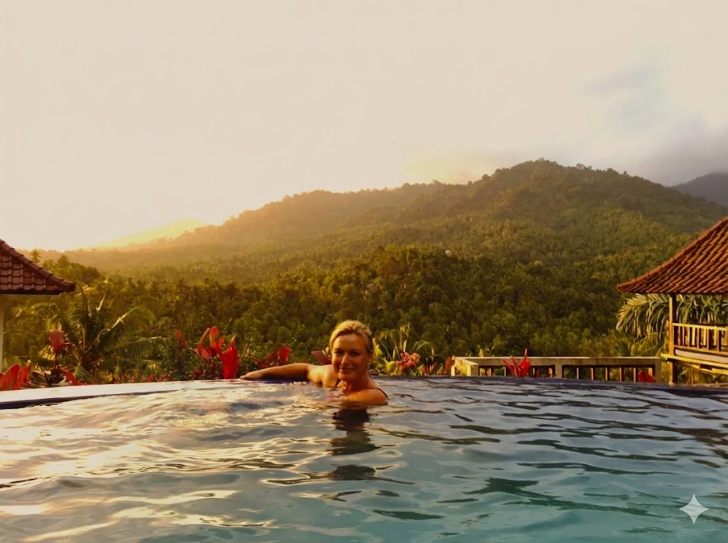 Auto gehuurd en vertrokken uit Canggu . Er word hier links gereden en verders staat alles qua open qua verkeersregels. Het is een gemotoriseerd gekkenhuis . Het stuur zit aan de verkeerde kant een ook de schakelpook zit op een vreemde plek . Denk je richting aan te geven ,gaan de ruitenwissers aan . Lol . Afijn we leven nog en zitten op een wonder mooie plek in het noorden van Bali . Na twee nachten lepeltje lepel met zoute surfAussies in een slaapzaal hebben we ons zelf nu geüpgrade . Het hotel “Villa Jembrana “ ligt beeldschoon verborgen in de bergen met weids uitzicht op een vallei waar een rivier door heen slingert . Hoeveel schoonheid kan je aan en dan is het personeel ook nog eens super lief . We zwemen in de rivier en met een zachte plof valt er een kokosnoot in het gras . De meiden gaan met een bommetje de Infiniti pool in ik slurp heel tevreden aan een Bintang .