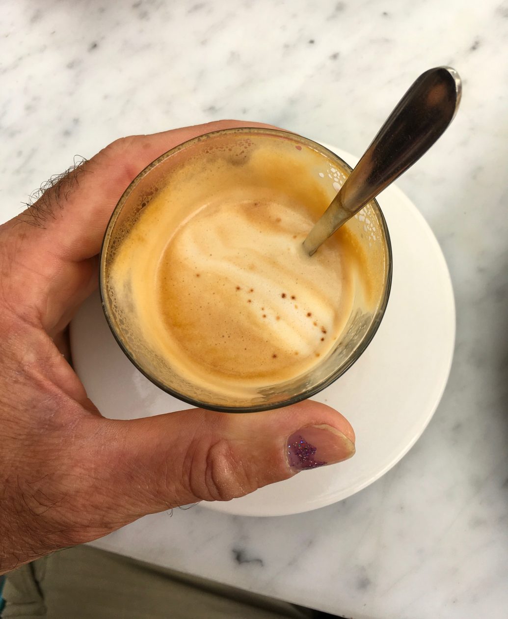 Waar zitten we? Bij Sisterfields. Een ingetogen Miami Vice-achtige sfeer. Loungemuziek en een grote zilveren La Marzocco-espressomachine op de witmarmeren balie. Coffee-wise zit je dan goed.