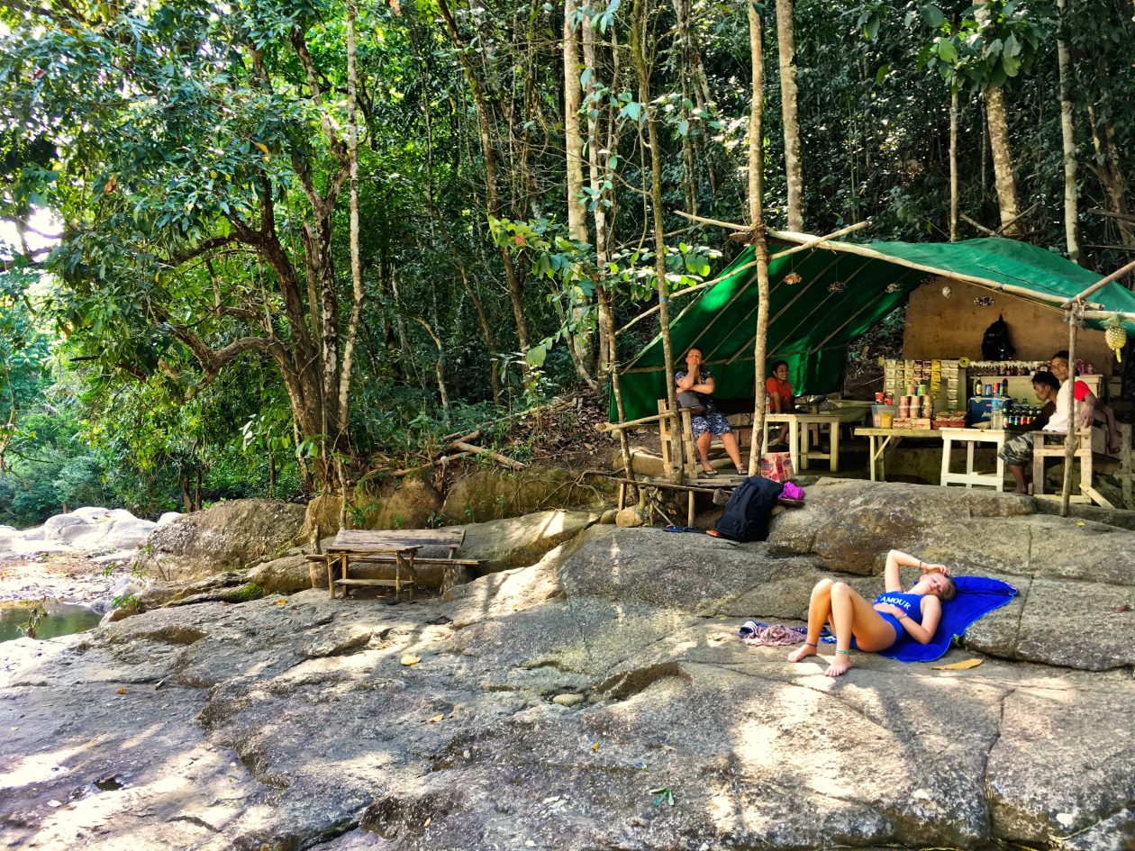 Bij de ingang van het dorp moet je een gids nemen die je naar de waterval leidt en laat zien waar je niet te pletter valt. Er is geen elektriciteit, dus cola en Bintang worden lauw geserveerd.