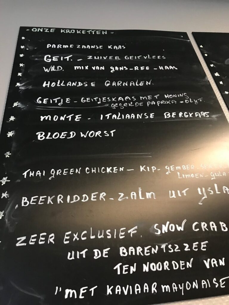Deze omweg heeft een reden Een jaar terug stond er een leuk stuk in de krant over deze tent . Cafetaria krokettenKunst van Rien Prinsen .Tientallen handgemaakte tot kunst verheven kroketten hangen in krijt geschreven op de wanden van zijn mini kroketten paradijs . Dochterlief neemt een geitenkaas met honing kroket en ik neem om te beginnen de SnowCrab kroket met kaviaar mayonaise