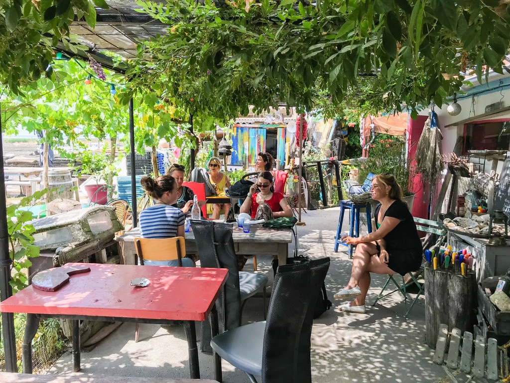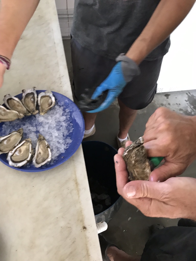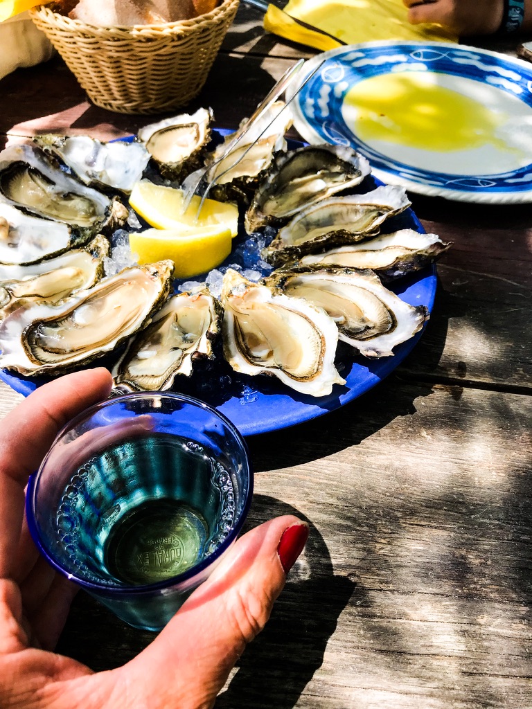 Man, dit zijn de beste oesters die we tot nu toe gegeten hebben. Eva mompelt dromerig: “Hmmm, romig,” en rolt met haar ogen. Even onthouden: “Station des Gus – ” in Andernos-les-Bains.