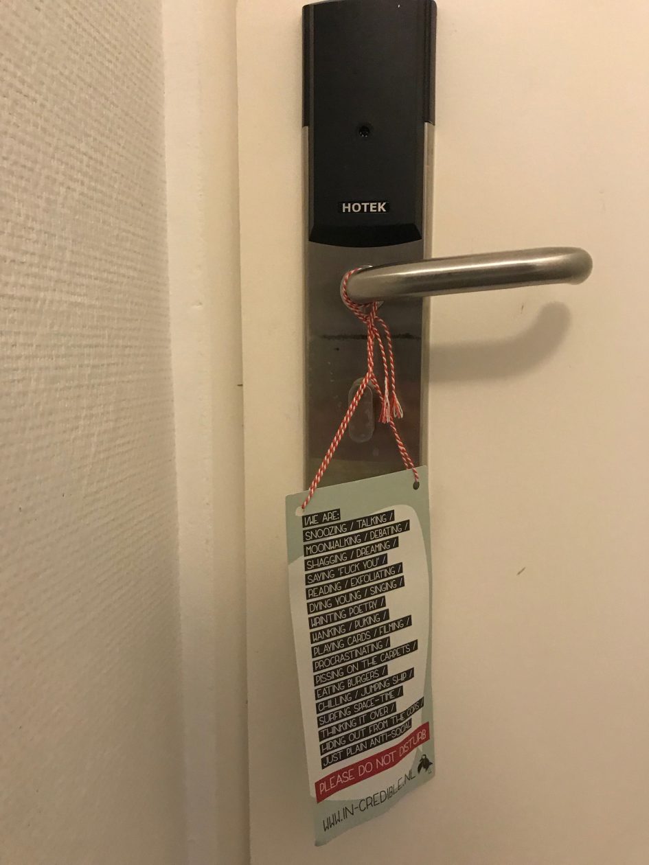 Goedemorgen. Wakker worden in Hotel Credible en een beetje spijbelen op maandagochtend voelt verdomd goed. Het zit in het woord: mini roadtrip. Klein maar fijn, maar hij is bijna ten einde. Via de Afsluitdijk langs hotel Post-Plaza in Leeuwarden en een pitstop bij Krokettenkunst in Nieuw-Weerdinge. Een nacht de bak ingedraaid in Almelo bij Hotel Huis van Bewaring. Een toffe lunch bij het Honigcomplex bij De Meesterproef en toen op een draf naar Hotel Credible in Nijmegen. Het was fantastisch.
