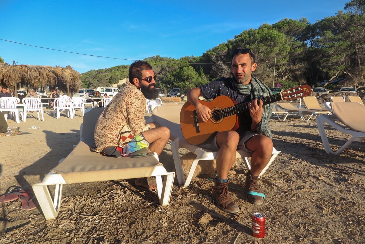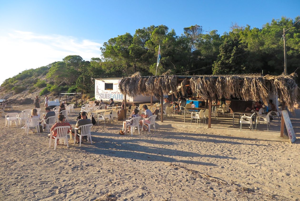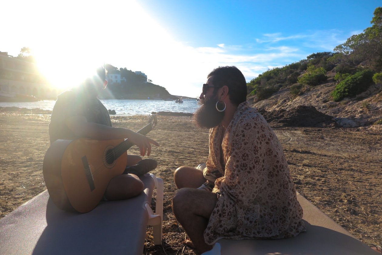 De terrasstoelen staan opgesteld als in een theater, met als hoofdact de ondergaande zon. Achter de bar staan een paar vrolijke gasten cocktails te mixen. Een stevige Duitser neemt ritmisch een slok bier en een haal van zijn sigaret: bier, sigaret, bier, sigaret. Fernando de gitarist, op zoek naar de zon, is ondertussen ook op het terras neergestreken. Door je toegeknepen ogen zie je in het felle licht de schaduwen langer worden, totdat de zon verdwenen is. Nog een laatste slok en dan de vraag: “Waar gaan we vanavond eten?” Het leven op Ibiza is plezierig eenvoudig. Salud!