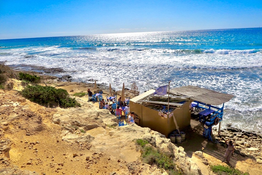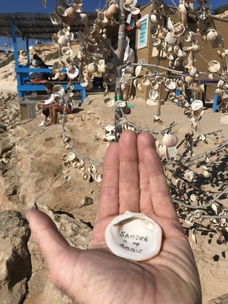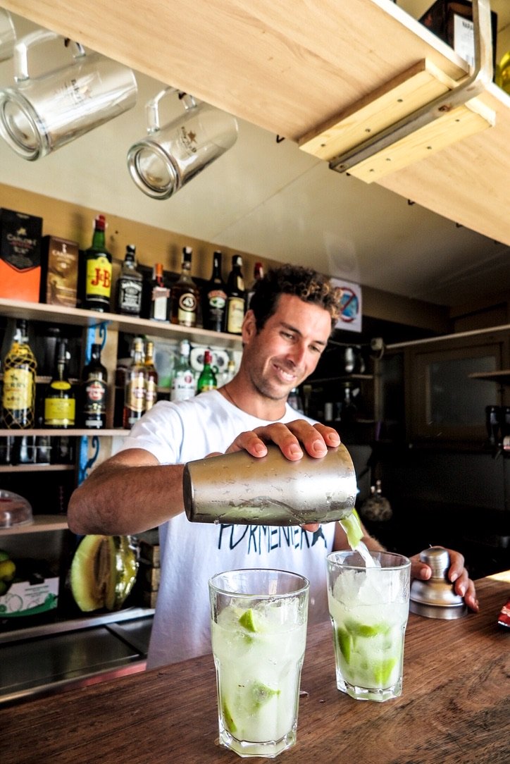 De eerste stop is een lunch bij de Blue Bar. Een goed gekozen naam, want je hebt hier een waanzinnig uitzicht over Playa de Migjorn. Daarna ga je op zoek naar Kiosco Bartolo, een tof café aan de zee. Het is een heerlijk ‘schuurtje’ pal aan het water, gerund door meneer Bartolo en zijn zoons, die waanzinnige mojito’s shaken. Het idee om terug naar Nederland te gaan, lijkt met de minuut idioter.
