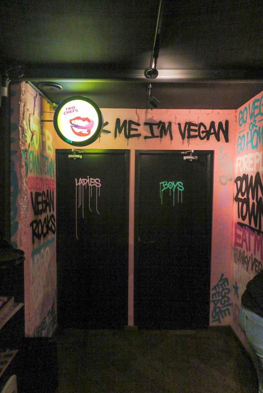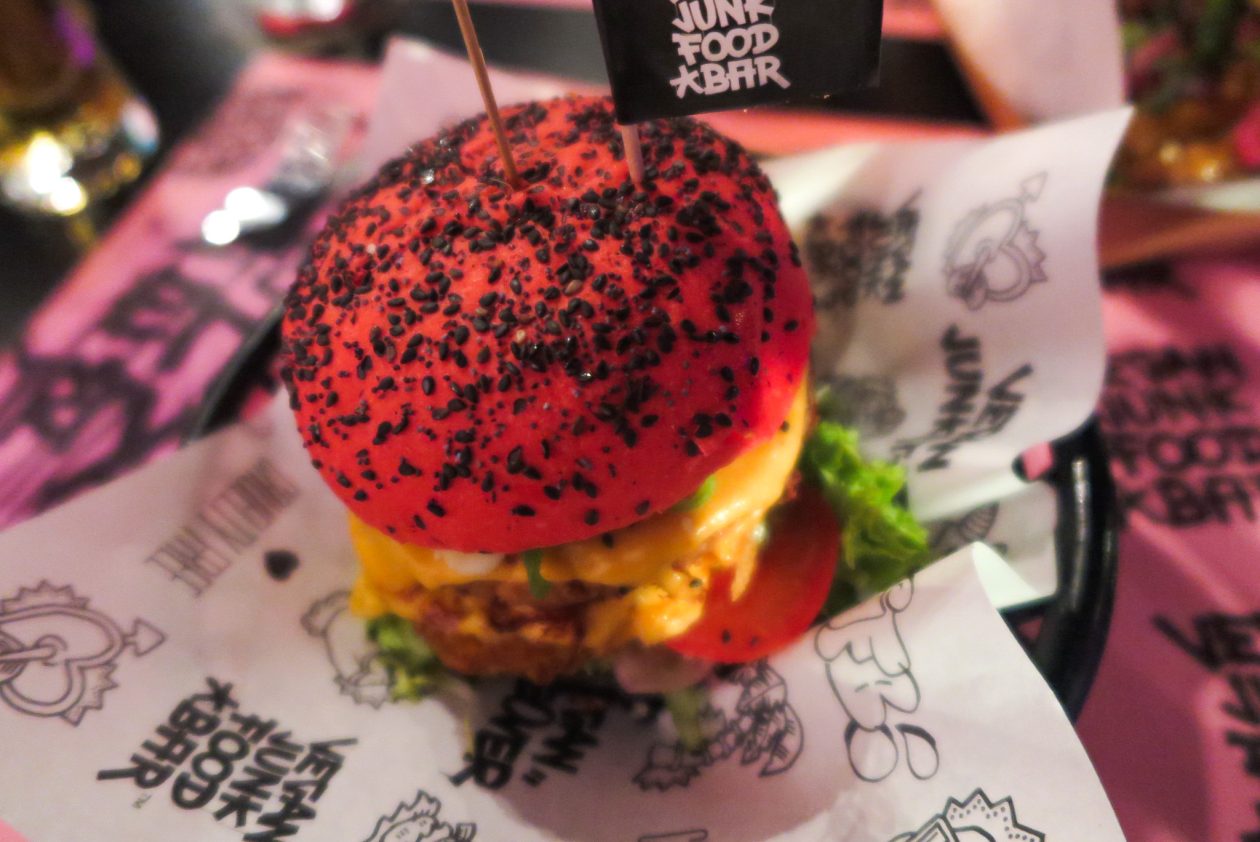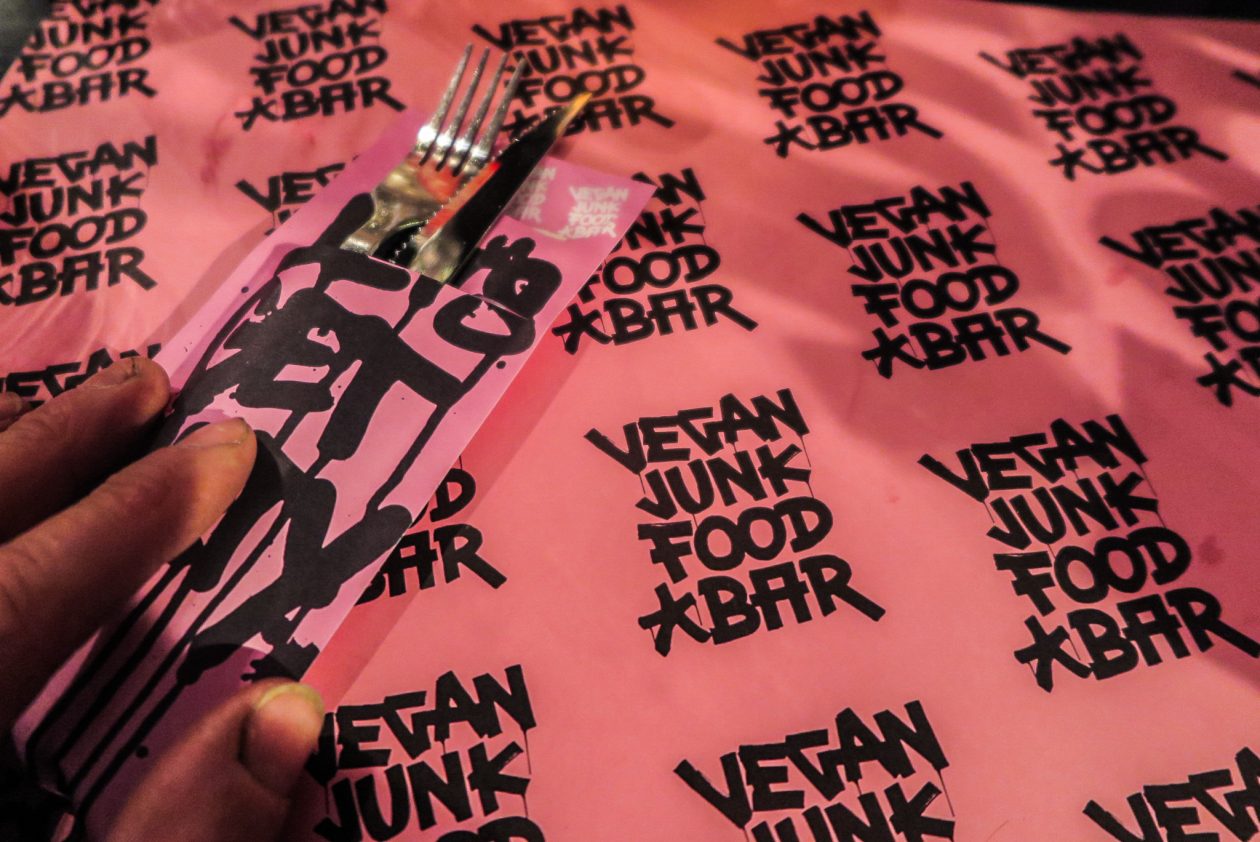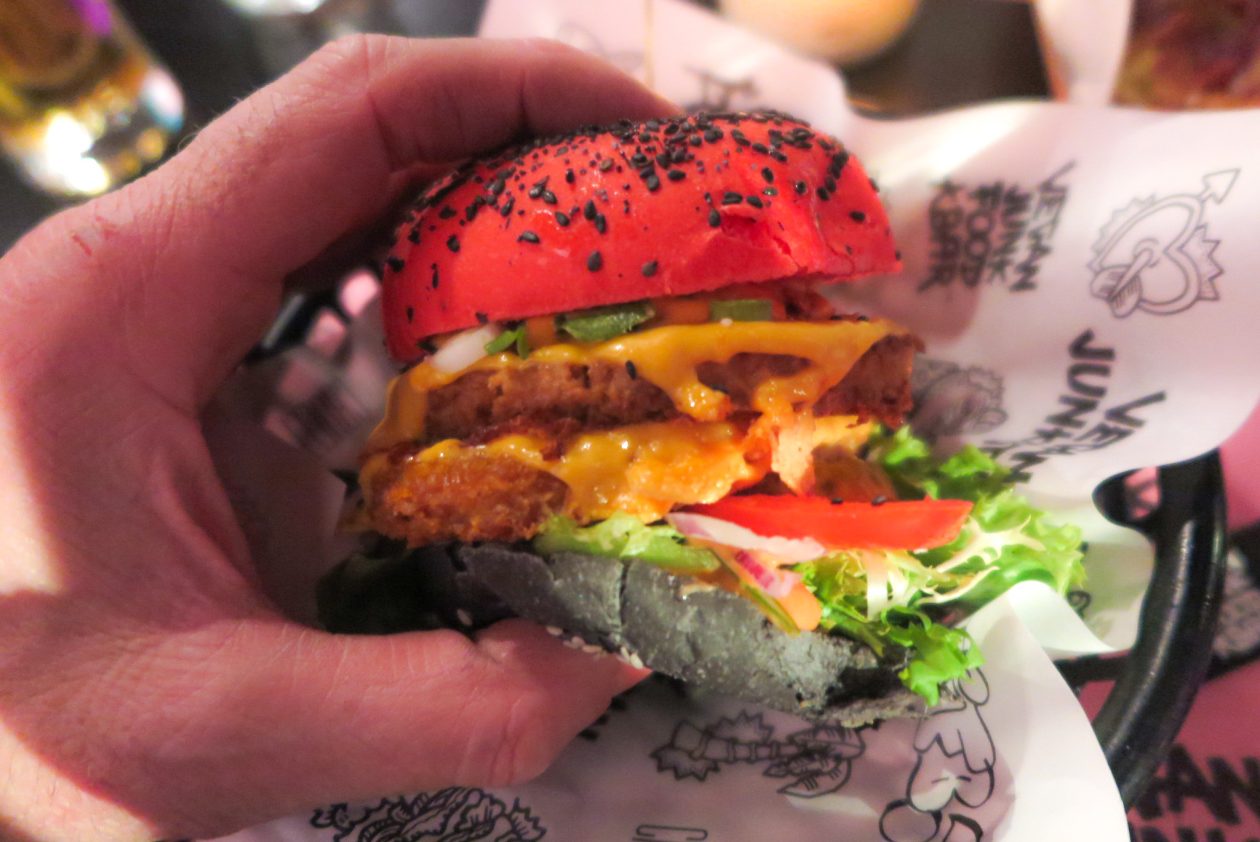 Er staat een kleine rij als we aankomen; de tent is afgeladen. Eenmaal binnen worden we naar onze plaats geleid door een beeldschoon Engels vegan meisje. Roze is de kleur, urban het gevoel. Jools bestelt de “Original”: Juicy plant-based beef 3.0, cheddar, lettuce, tomato, red, spring & fried onion mix, pickles en VJFB® sauce met Waffle Fries. Ik neem de “Notorious Sumo 3.0”: Juicy double plant-based beef 3.0 + crunchy Mc Chickie on a black bun, cheddar, lettuce, tomato, red, spring & fried onion mix, pickles, jalapeños + Original VJFB™ sauce®.