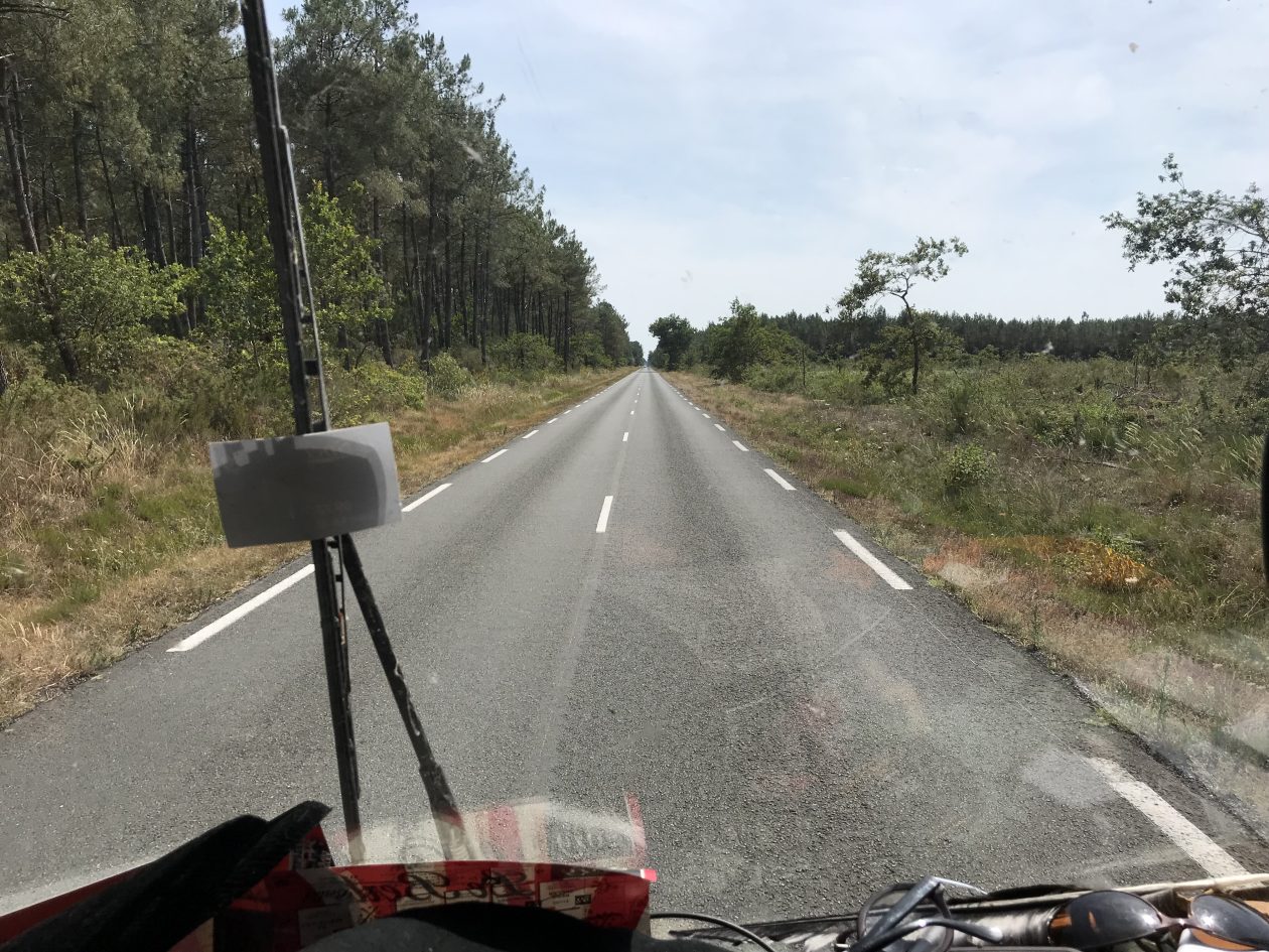 Ik was bijna vergeten hoe lekker het is om in Frankrijk rond te rijden. Eerst met je kop in de wind het zout van je lippen likkend op de pont van Royan naar Le Verdon/Bordeaux. De ramen open en met 80 km per uur over de kaarsrechte D1215, langs eindeloze dennenbossen richting Cap Ferret. Net als je denkt: “Ik zou wel wat lusten”, staat er in de berm een knalgeel bord met “Poulet Rôti – Moyen Gros”. Even later zitten we te picknicken in het gras met kip, aardappelen en een klodder Zaanse mayo. Het leven is verrukkelijk.