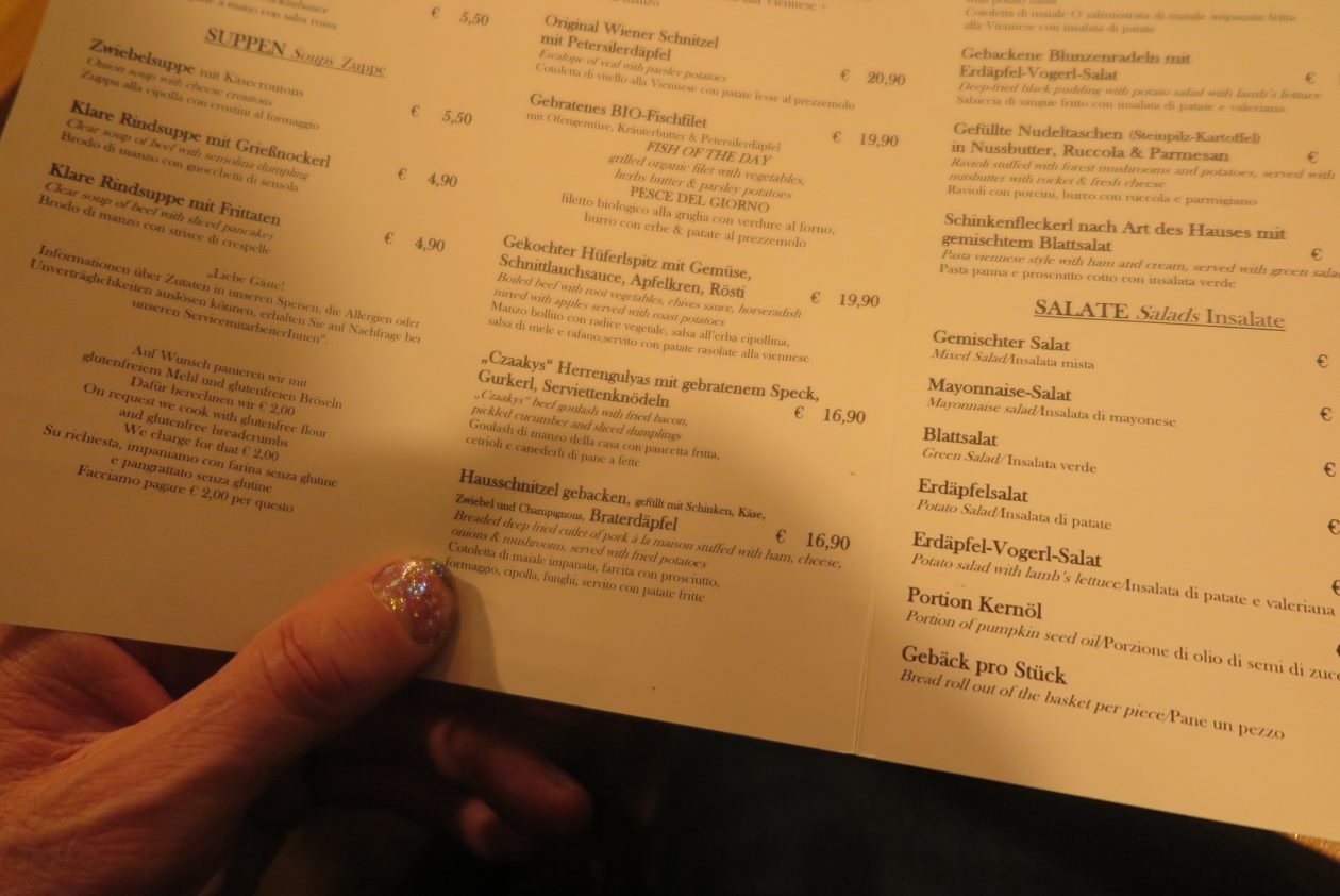 “Als je op zoek bent naar de Oostenrijkse keuken, ga dan naar Czaak,” was zijn antwoord. Czaak is een prima tent met obers in het zwart-wit die hun vak verstaan. Vanuit de keuken klinkt het sissen van de pannen, aangevuld door het tikken van het bestek op de borden, en de rest van Czaak wordt gevuld door het gekwetter en lachen van de gasten. Gemütlich is het woord. Proost!
