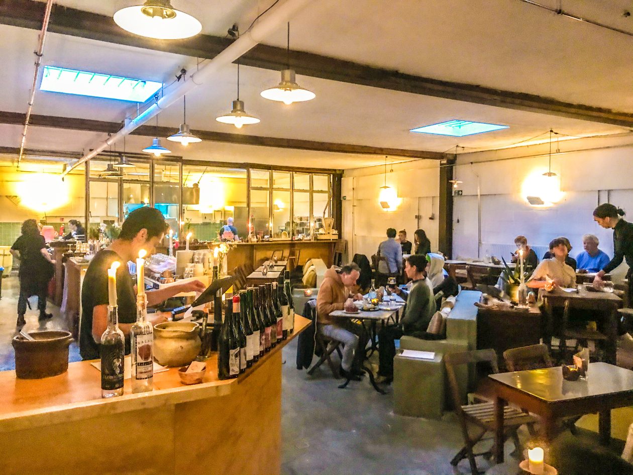 Ook hier draai je soepel met je 8-cilinder lowrider een parkeerplaats op. Duw de deur open van de voormalige garage, bestel allereerst een fijne cocktail en loop dan al nippend van je glas met je vingers door de menukaart. Het interieur is gezaagd uit een stapel underlaymentplaten, zitten doe je op vintage meubels en het licht is afkomstig van de kaars op tafel. Uit de open keuken zijn ondertussen vurrukkulluke happen op onze tafel beland. Proost op Noord!
