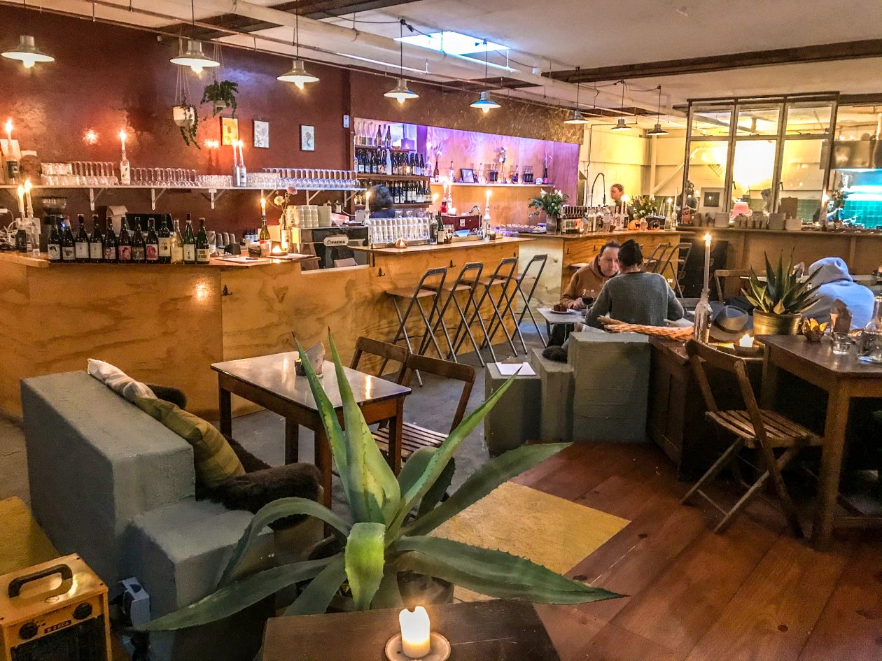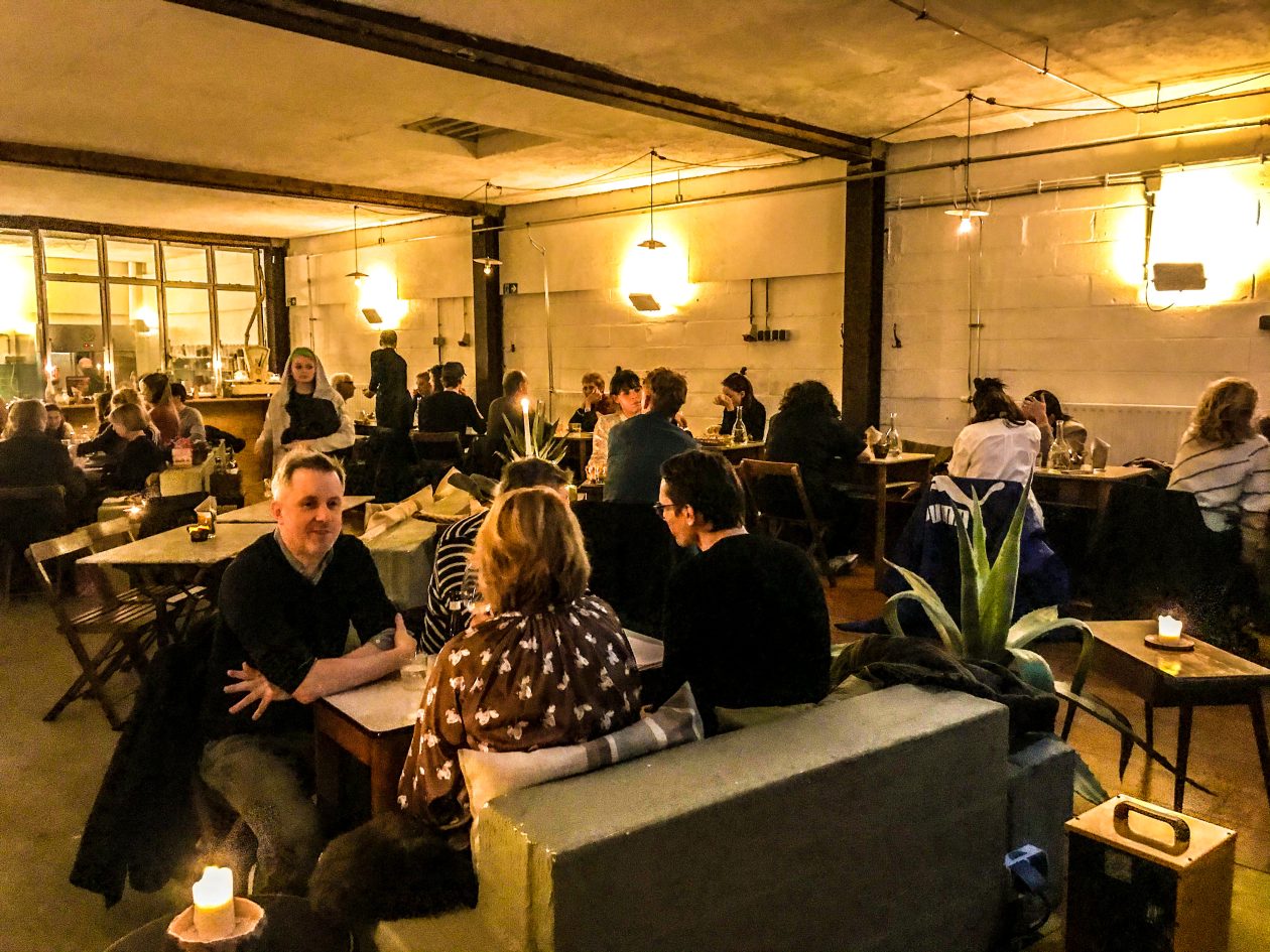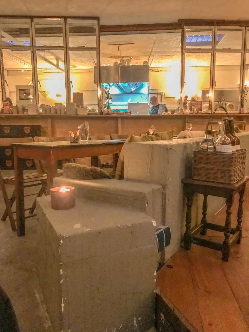 Ook hier draai je soepel met je 8-cilinder lowrider een parkeerplaats op. Duw de deur open van de voormalige garage, bestel allereerst een fijne cocktail en loop dan al nippend van je glas met je vingers door de menukaart. Het interieur is gezaagd uit een stapel underlaymentplaten, zitten doe je op vintage meubels en het licht is afkomstig van de kaars op tafel. Uit de open keuken zijn ondertussen vurrukkulluke happen op onze tafel beland. Proost op Noord!