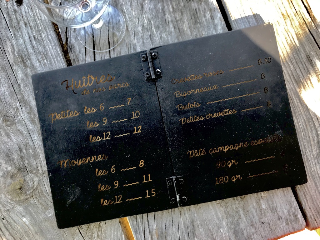 Later hoorde ik de reden van de ‘petite’ menukaarten. De restaurants (cabanes) zijn van de oesterboeren. Ze mogen wel direct uit de zee in hun schuurtjes oesters verkopen, maar geen ‘restaurantje spelen’. Voilà. Uit dezelfde bron hoorde ik dat dit stukje Bordeaux ook wel “de gouden vierkante meters” wordt genoemd, vanwege de krankzinnige huizenprijzen.