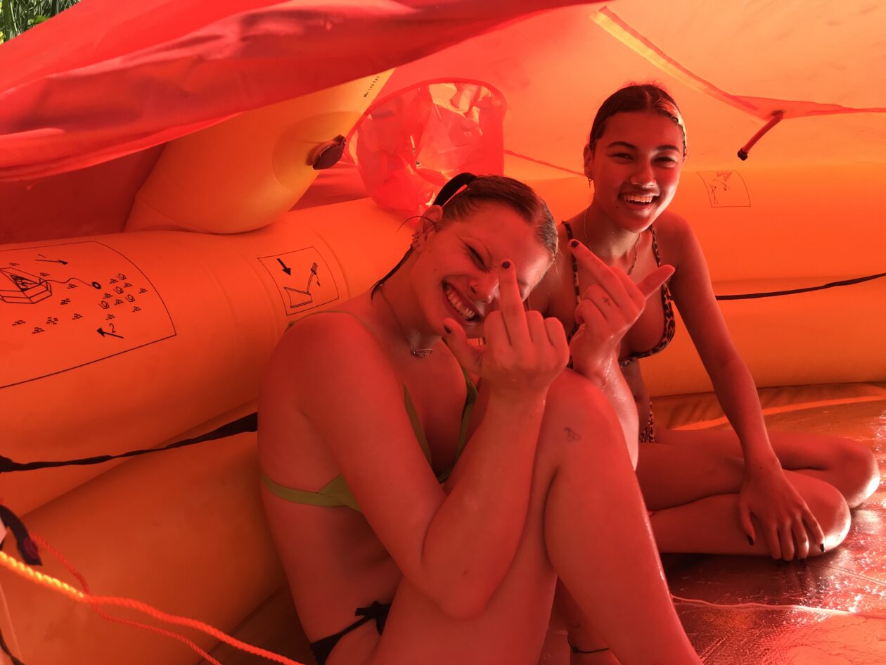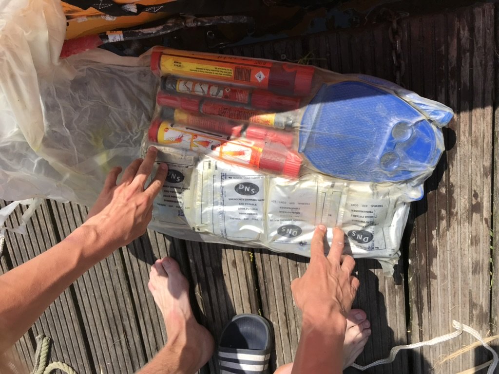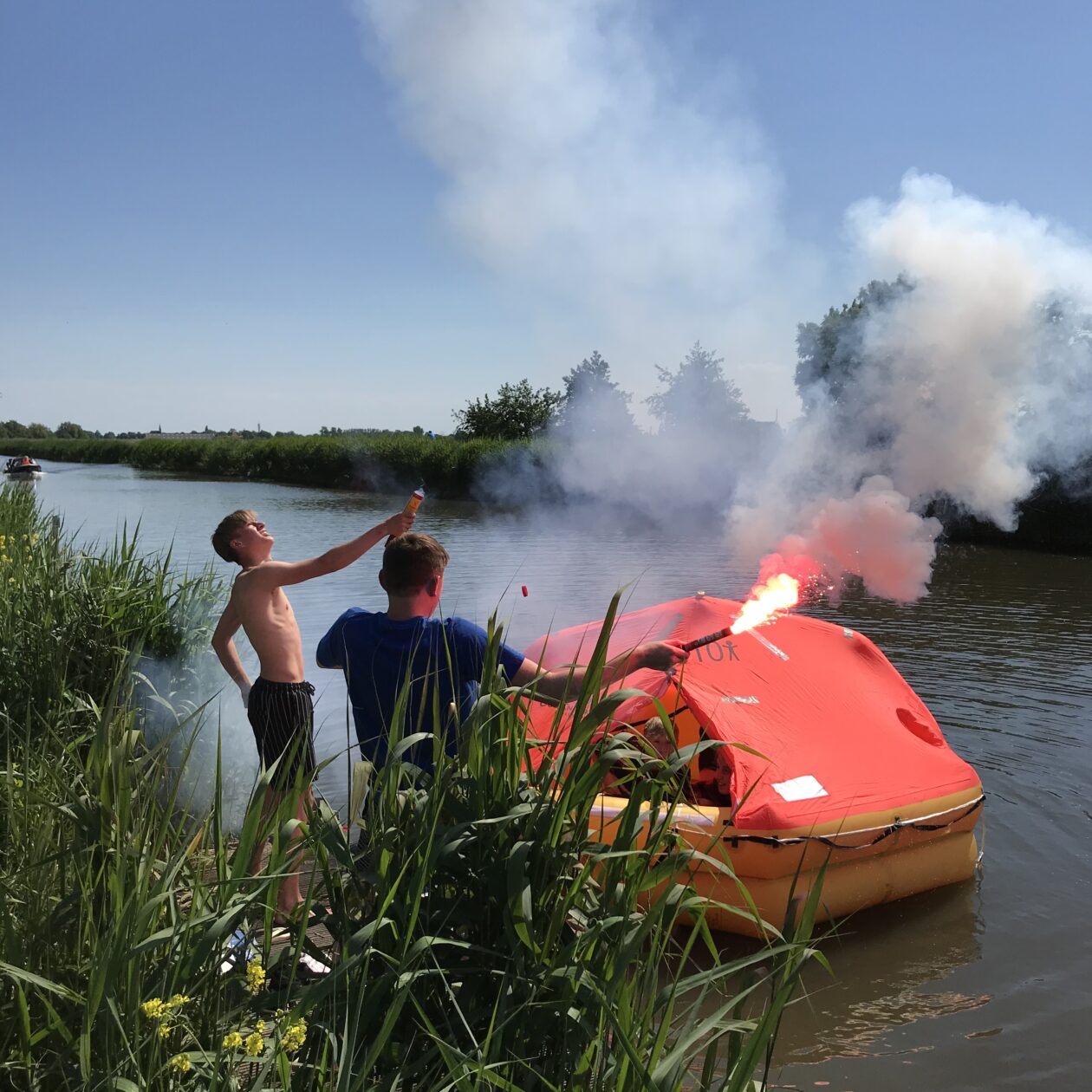 Ons vlot voldeed aan alle verwachtingen en blies zichzelf heel vlot op: van cocon naar een enorme, feloranje dobber. Aan boord bleek ook een soort noodpakket aanwezig te zijn. De noodvuurpijl was al gauw enthousiast gevonden. Net toen ik zei: “Niet afsteken!”, schoot de pijl als een raket uit de rietschoot en knalde op een kilometer hoogte met een enorme klap uit elkaar. Een hel oranje licht, dat tot in Amsterdam gezien kon worden, daalde heel langzaam aan een miniparachute naar beneden.