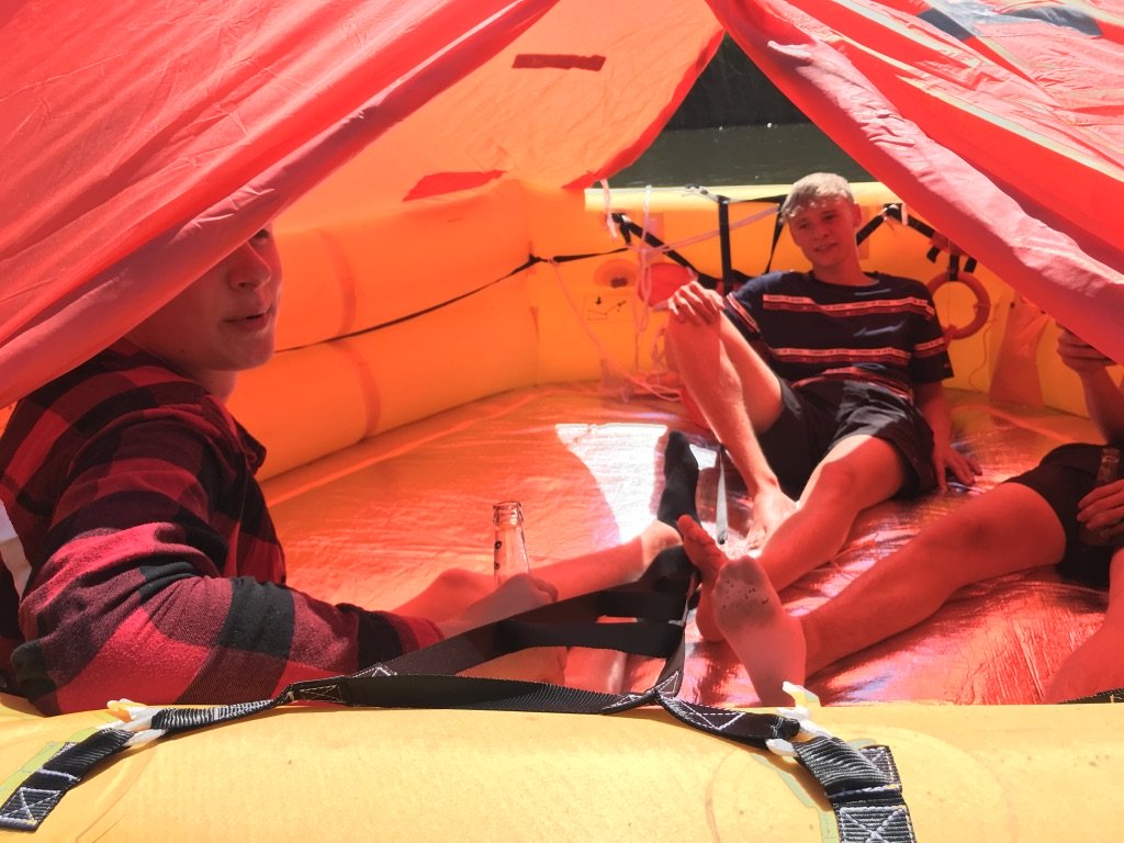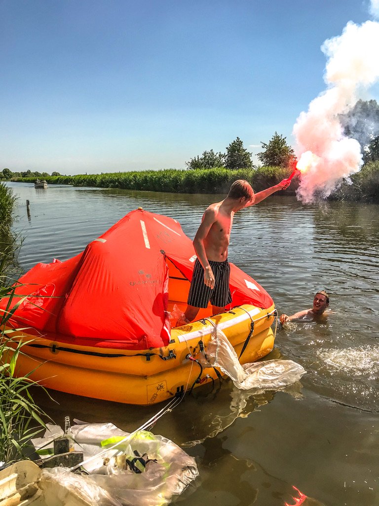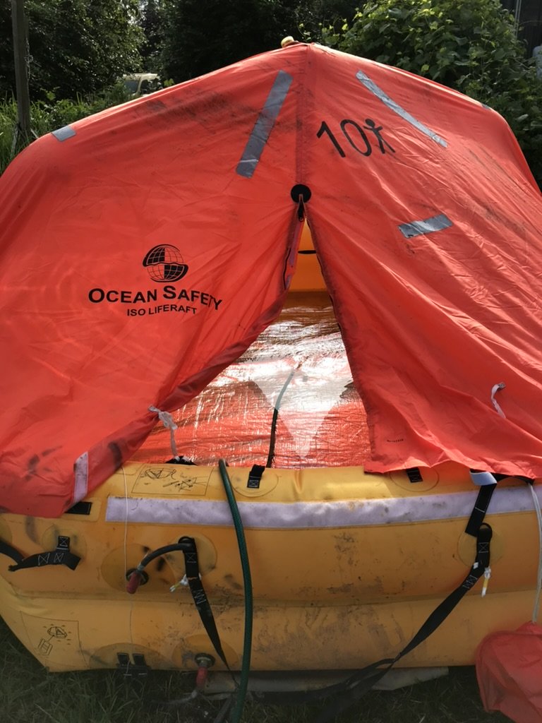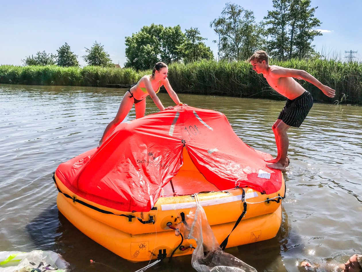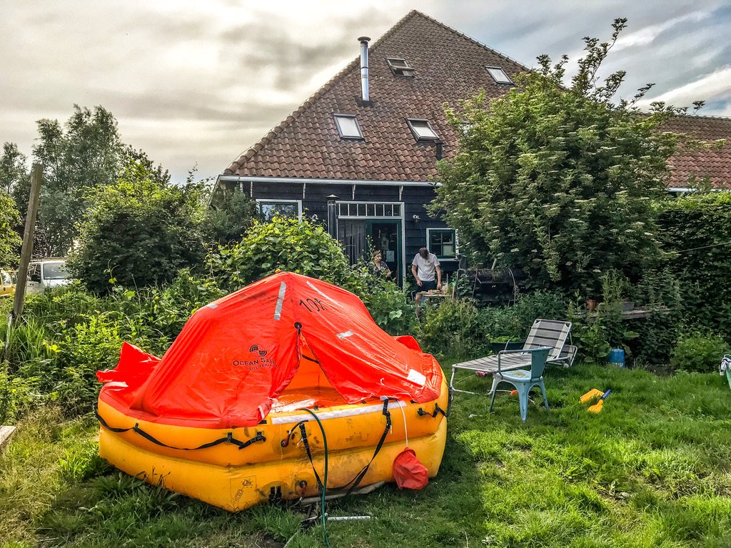 Reddingsvlotten op zeewaardige boten moeten elk jaar gekeurd worden. Als een eigenaar van een jacht denkt dat het tijd is voor een nieuw vlot, kun je voor een leuk bedrag zo’n oud vlot aanschaffen. Het zit verpakt in een soort hardplastic huls waar een touw uit hangt. Als je daar hard aan trekt, blaast het vlot zichzelf op — als het goed is.