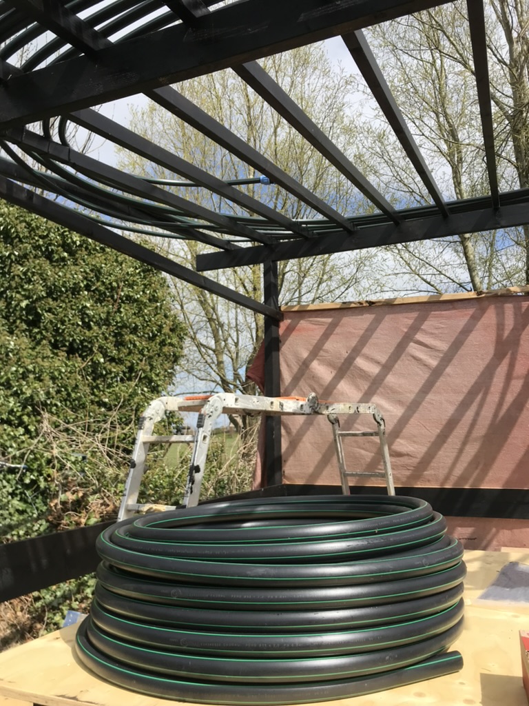 Volgorde – zet de gewenste maat van je chill hut uit – spit vier gaten in je tuin op elke hoek. Als de ondergrond slap is, sla je er nog een paal in en daarna giet je er beton in – in het nog slappe beton steek je een stalen strip – deze gebruik je later om je vier basispalen mee vast te zetten – schroef de twee zijkanten in elkaar in het gras. Vriendschap is een mooi ding – en twee vrienden is genoeg – linkerzijkant overeind zetten op de betonnen poeren en rechts overeind zetten – dwarslatten erop schroeven en hij staat – Als dak gebruikte is plastic zon doorlatend golfplaat met daaronder 50 meter tyleen buis 32 mm diameter om op een zomerdag warm water te hebben voor buitendouche en bad – geloof me – het werkt.