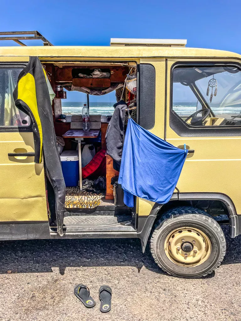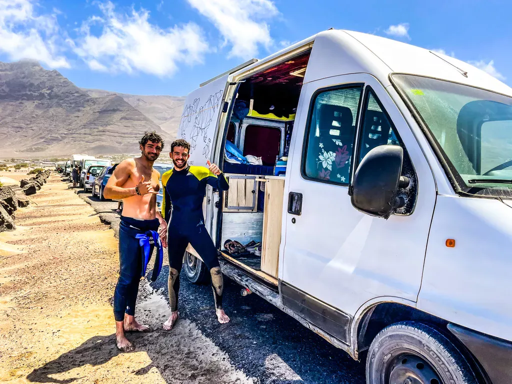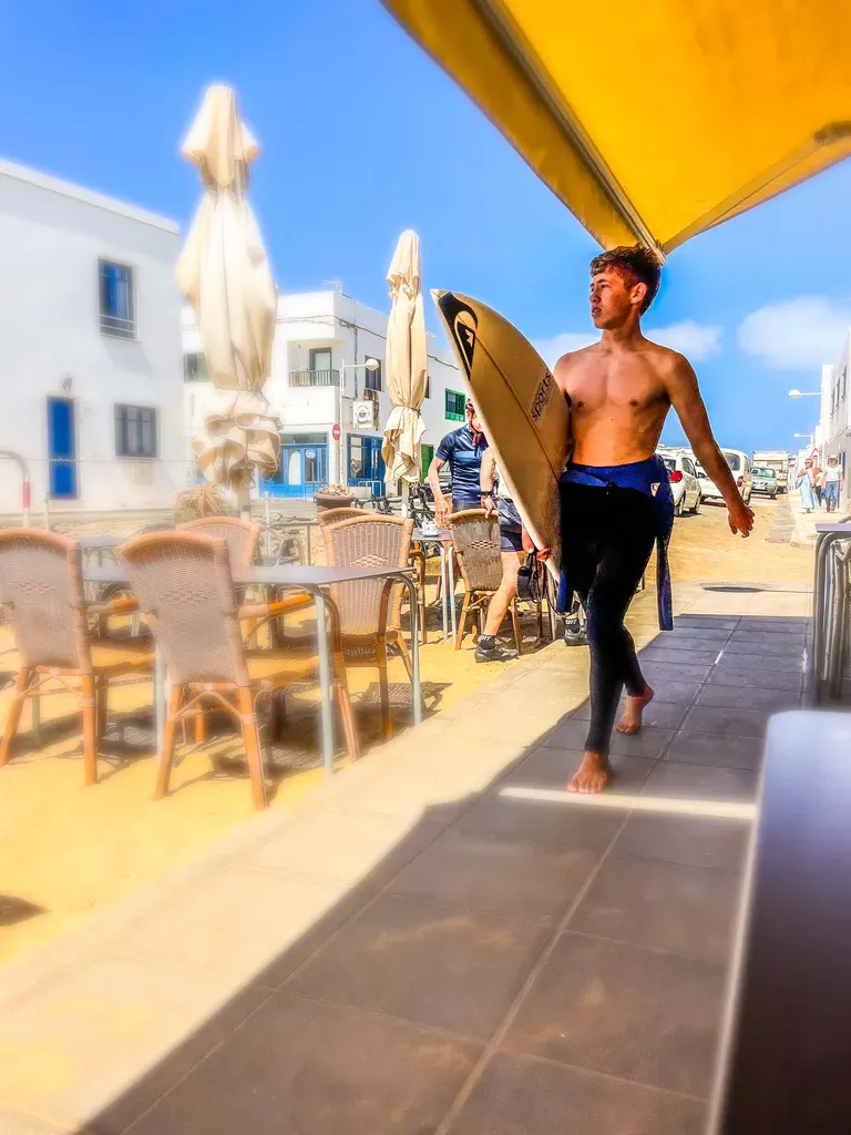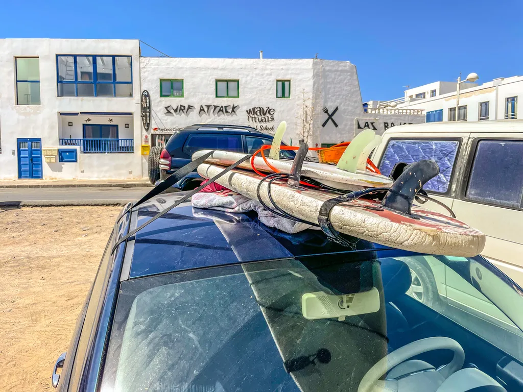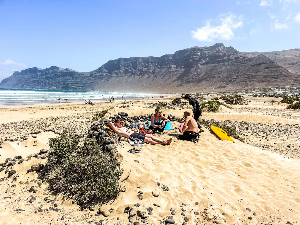Canarische Eilanden / Lanzarote – Caleta de Famara: een zanderige hoofdstraat met aan weerszijden witte blokwoningen en een handvol lome restaurantjes en surfshops. Het dorp ligt pal aan de oceaan, waar de golven stukslaan op de zwarte lava. Iets buiten het dorp ligt een lekker zandstrand met een bescheiden duinenrij, waar de surfhippies hun busjes geparkeerd hebben. We logeren in een relaxed appartementje met een balkon met zeezicht en dat is meer dan zat.