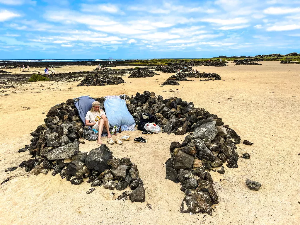Canarische Eilanden / Lanzarote – Caleta de Famara: een zanderige hoofdstraat met aan weerszijden witte blokwoningen en een handvol lome restaurantjes en surfshops. Het dorp ligt pal aan de oceaan, waar de golven stukslaan op de zwarte lava. Iets buiten het dorp ligt een lekker zandstrand met een bescheiden duinenrij, waar de surfhippies hun busjes geparkeerd hebben. We logeren in een relaxed appartementje met een balkon met zeezicht en dat is meer dan zat.