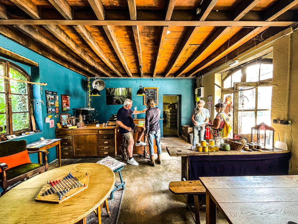 Frankrijk/Morvan /Saint Prix – Victor , vriend en oud collega heeft al jaren terug zijn plek gevonden in de Morvan – Victor is een duivelskunstenaar met hout – maar de liefde om uit een boom, kozijn/raam/ deur en trap te zagen bekoelde – en nu is de timmerman , bierbrouwer en kastelein geworden en de oude timmerwerkplaats Brasserie Le Braconnier geworden – een lekkere plek voor de dorstige mens in het centrum van het dorpje –
