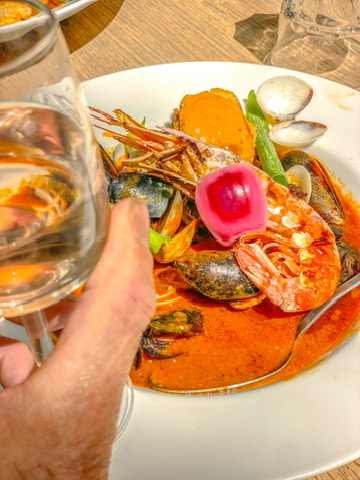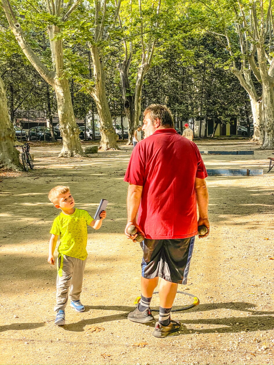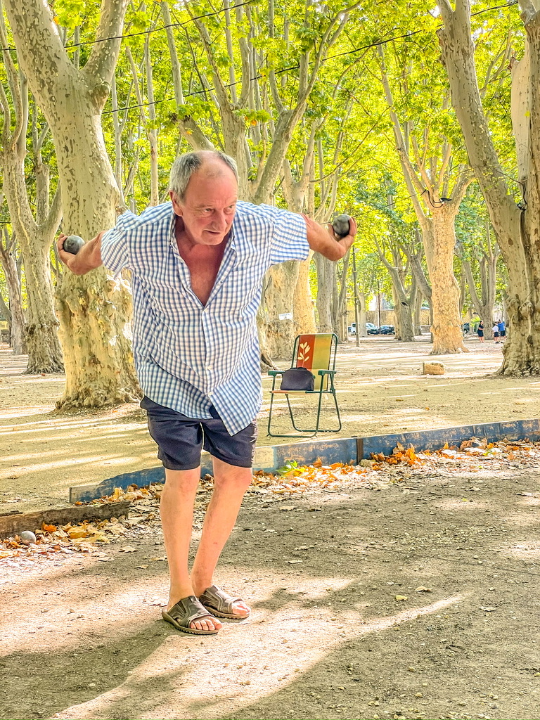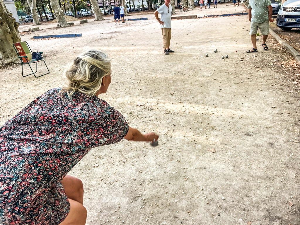 In de lome namiddag in mooi gefilterd licht word er petanque gespeeld – de ballen vallen met een fijne plof in het speelveld of worden met venijn en een stalen kets weggespeeld – bij twijfel word het meetlint gepakt en kijkt iedereen serieus – er is ook lol , want we worden uitgenodigd om mee te spelen – blijkt er ineens dat er allerlei regels en spelmethoden zijn – geen paniek, tis overzichtelijk leuk en vergt nog jaren van oefening -we kunnen alleen maar vooruit –