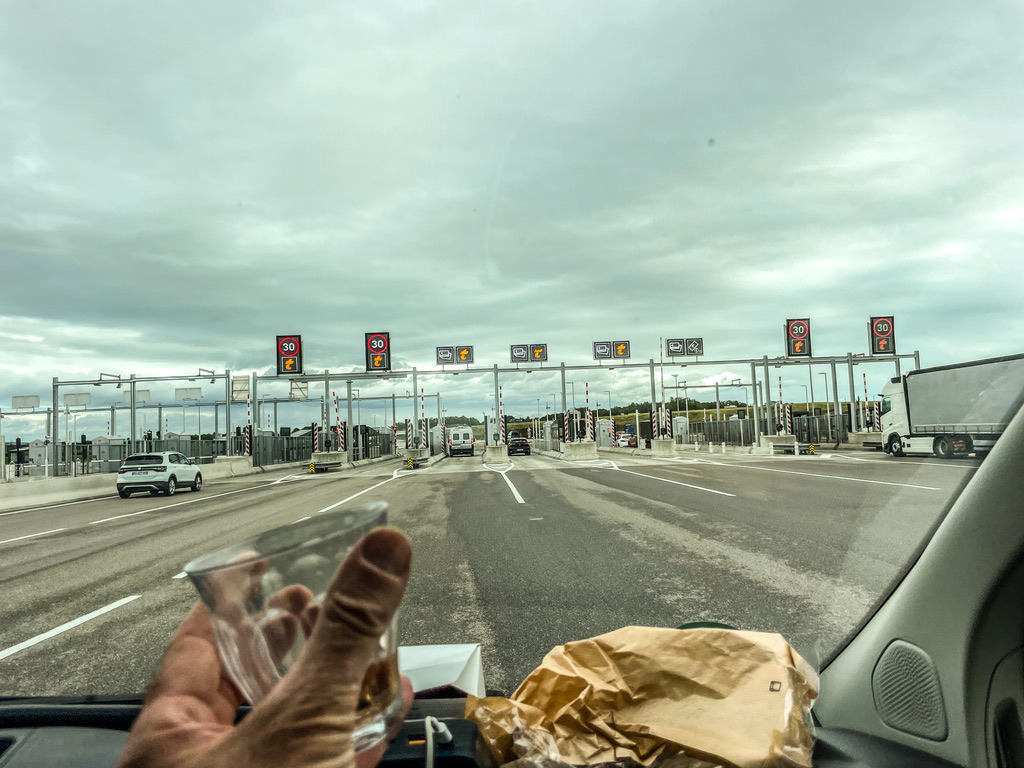 Idioot — en een soort van terug naar vroeger — was de douanepost bij de Nederlands-Duitse grens. Betonnen blokken dicteerden de route langs enorme garage-achtige tenten, verlicht met bouwlampen, met slagregen tegen onze voorruit. Fijn sfeertje.