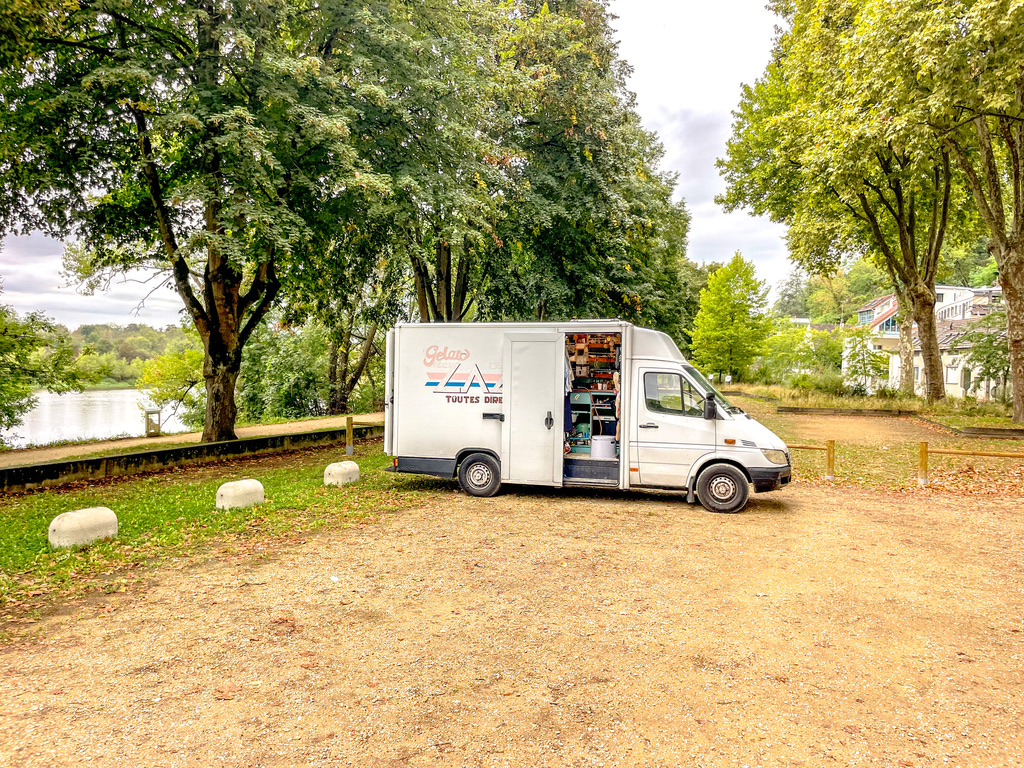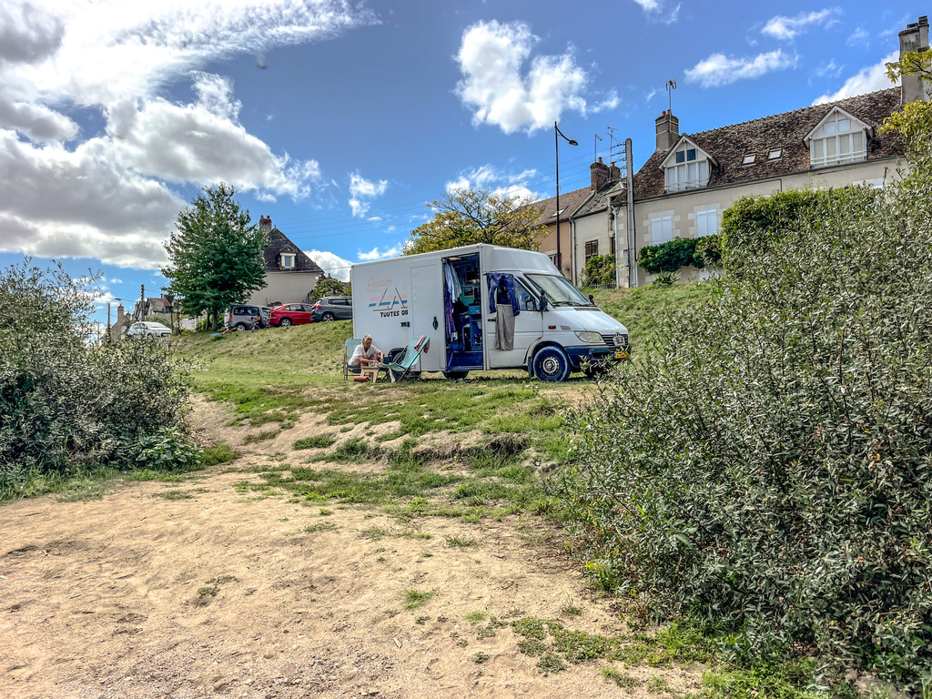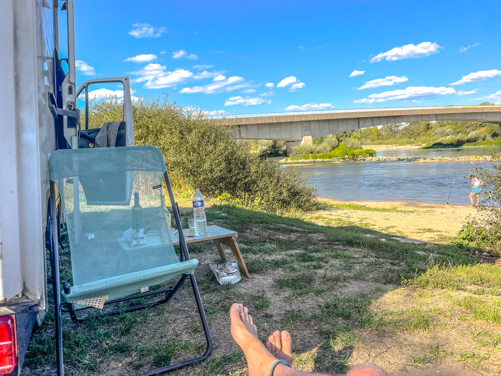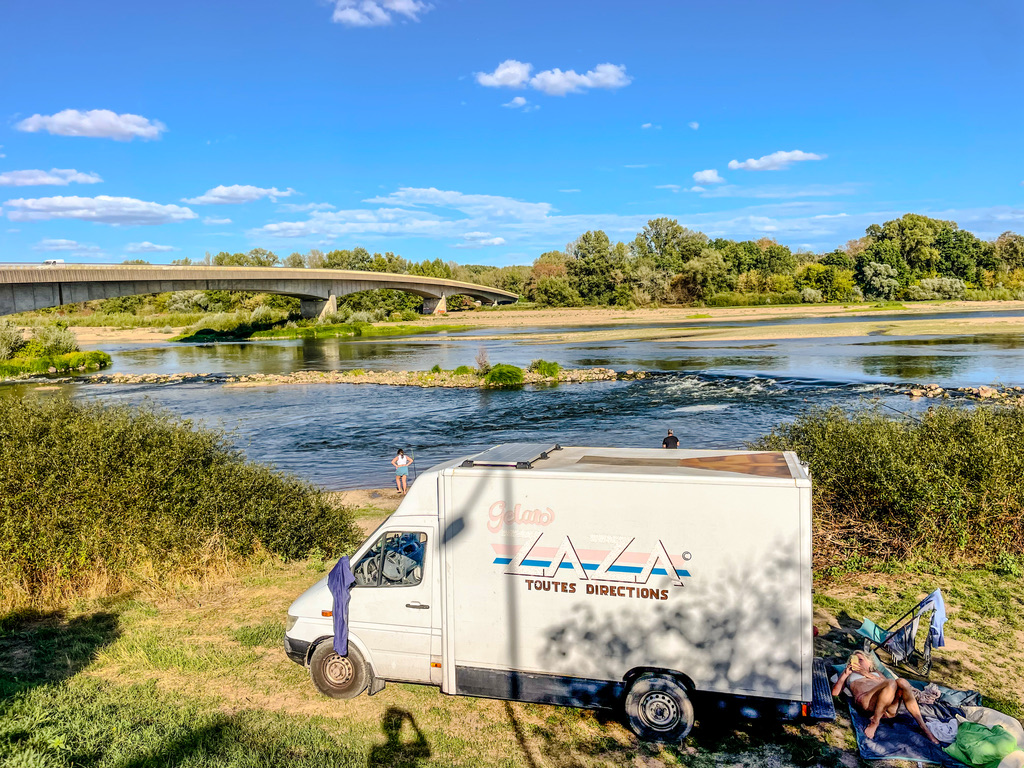 Tijdens het wroeten om los te komen, zagen we aan de overkant een potentiële overnachtingsplek. Na een uur zwoegen schoot de bus eindelijk los uit zijn zandgraf. Bezweet reden we over de brug naar Saint-Satur, aan de oever van de Loire. Een fantastische plek, direct aan de rivier en in de schaduw van het dorp, met uitzicht op de brug waar we eerst nog onder vaststonden. En dat alles met een fijne boulangerie op loopafstand. We wisselden de rivier af met de schaduw van de bus en waren diep tevreden met deze dag.
