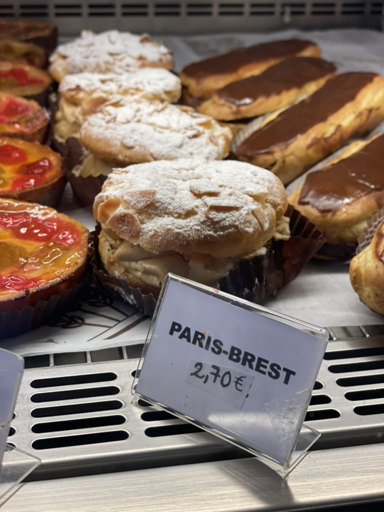 We dronken koffie op een bankje dat de gemeente daar vriendelijk voor ons had neergezet. Daarna pakten we de bus in en zetten alles vast wat los kon schieten. De eerste stop was een boulangerie. Ik vind het heerlijk om met bijvoorbeeld een éclair of andere zoetigheid te ontbijten; dit keer leek de Paris-Brest me een goed idee.