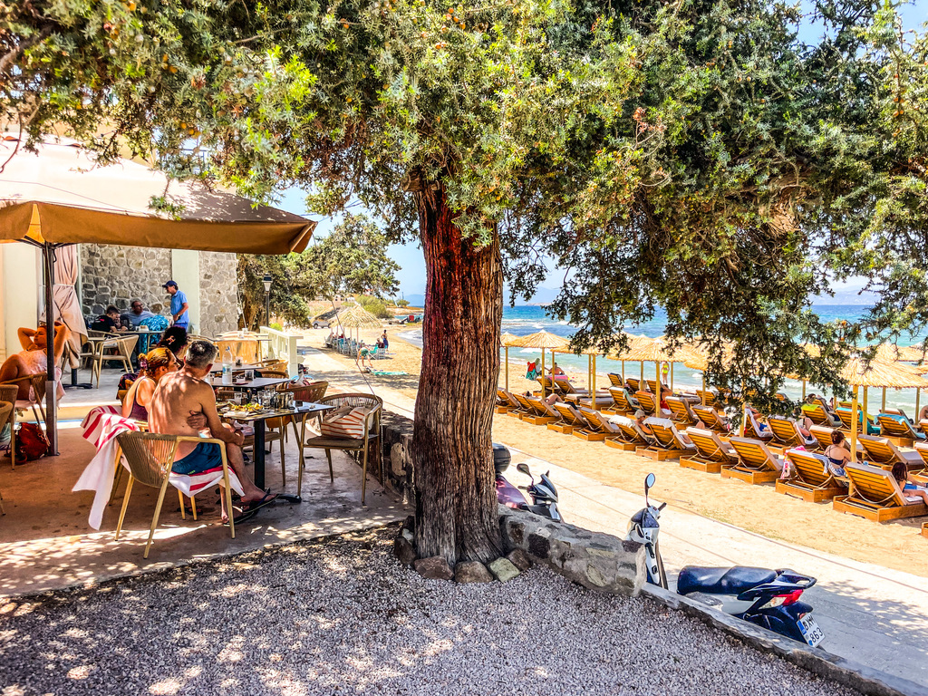 Marathonas beach – 50 cc is voor een Griekse scooter meer dan zat – Aegina is niet groot en snelheid past haar niet – er is weinig verkeer op de weg – de spichtige katten die hier wonen gebruiken het asfalt ook , alleen om te languit te chillen- vanaf Marathonas beach kijk je fijn vanaf je strandbed over de baai naar het herten eilandje Moni- de ober is hier fijn alert (die gozer komt er wel ) een biertje voor meneer is snel getapt – als je niet beter zou weten staat dit cafe qua looks op Ibiza of Bali – global social media style – je mag er wat van vinden , maar tegenhouden doe je het niet -proost.