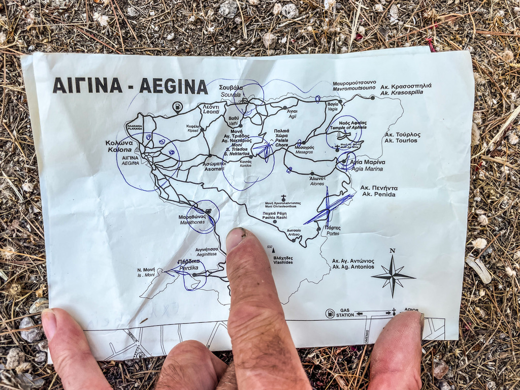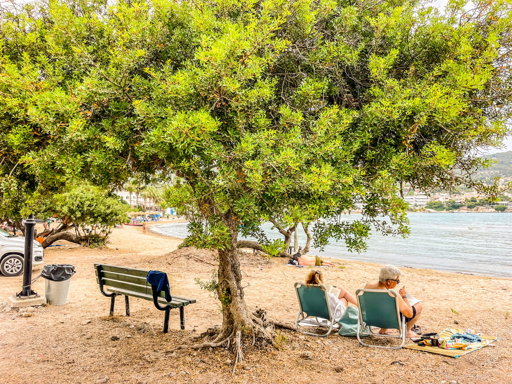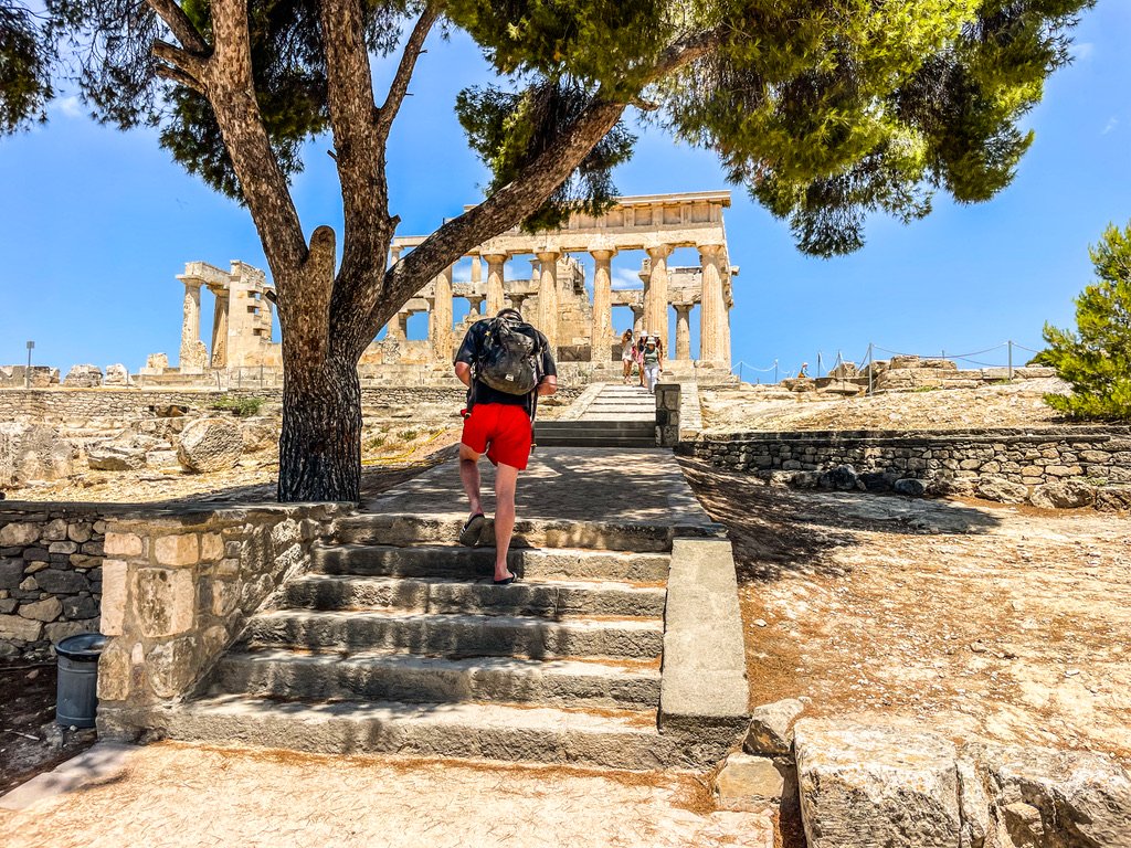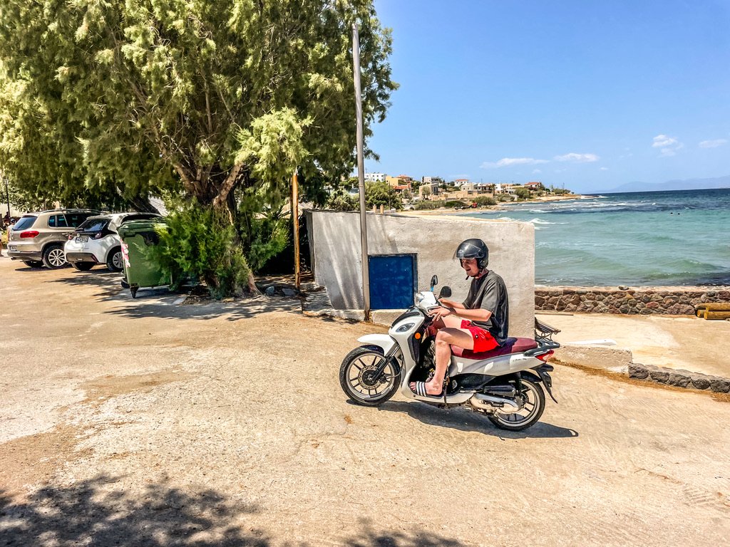 Egina – vagia Beach – op 40 minuten varen vanaf Piraeus ligt Egina – fijn eilandje om de hitte van Athene te ontsnappen – je huurt een scooter , rijd naar een leuk baaitje waar mee de wind fijn speelt , de schaduw ruim voorradig is en de ober gul en de urgentie van je dorst voelt – we hebben een slaapplek gehuurd bij David , iets buiten Agia Marina , met uitzicht op baai en dorp / zwembad en een lieve kat die luistert naar de naam Zoe – we spelen met plezier de toerist , het gaat ons makkelijk af – we bezoeken de Tempel /foto/ rijden naar Vagia beach /foto / lunchen met uitzicht op het tres picturesque baaitje met de zee zo blauw als de Griekse vlag .