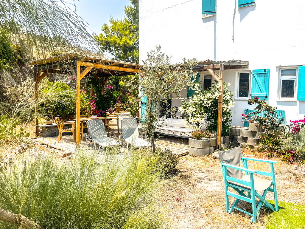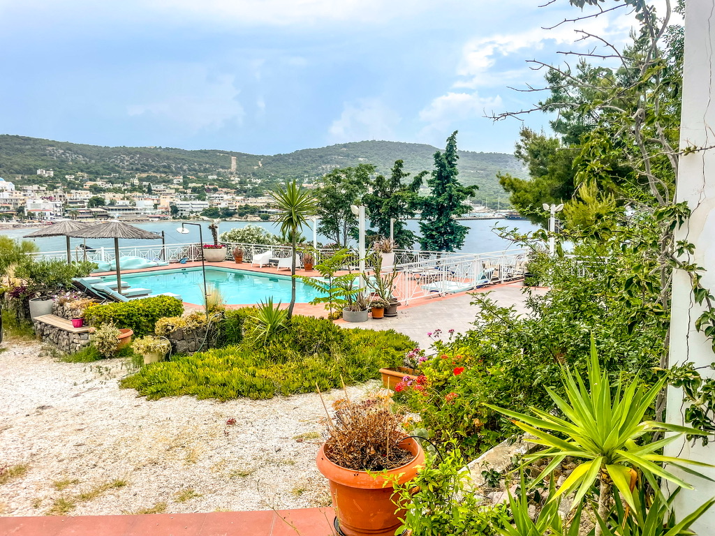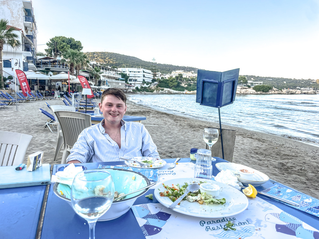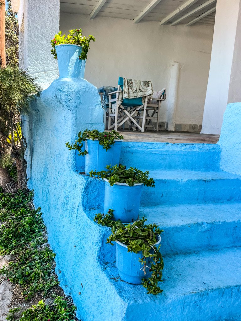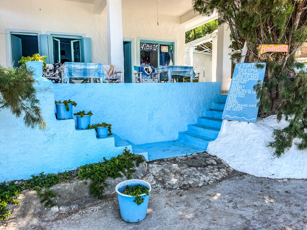 Egina – vagia Beach – op 40 minuten varen vanaf Piraeus ligt Egina – fijn eilandje om de hitte van Athene te ontsnappen – je huurt een scooter , rijd naar een leuk baaitje waar mee de wind fijn speelt , de schaduw ruim voorradig is en de ober gul en de urgentie van je dorst voelt – we hebben een slaapplek gehuurd bij David , iets buiten Agia Marina , met uitzicht op baai en dorp / zwembad en een lieve kat die luistert naar de naam Zoe – we spelen met plezier de toerist , het gaat ons makkelijk af – we bezoeken de Tempel /foto/ rijden naar Vagia beach /foto / lunchen met uitzicht op het tres picturesque baaitje met de zee zo blauw als de Griekse vlag .