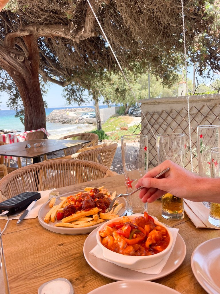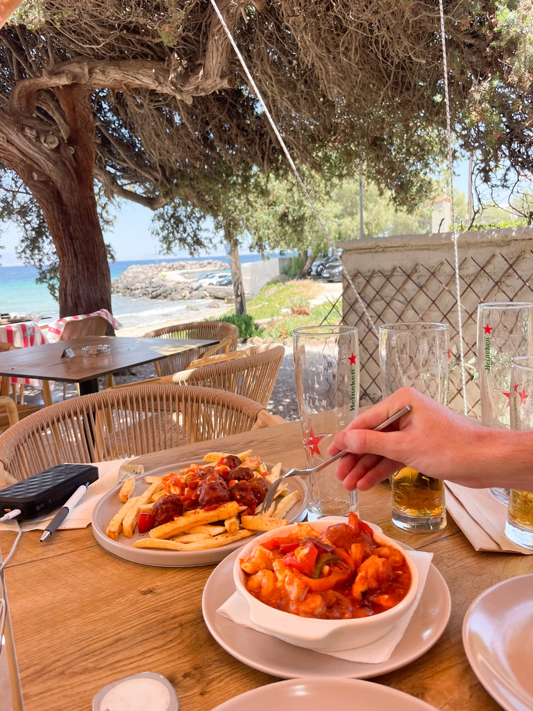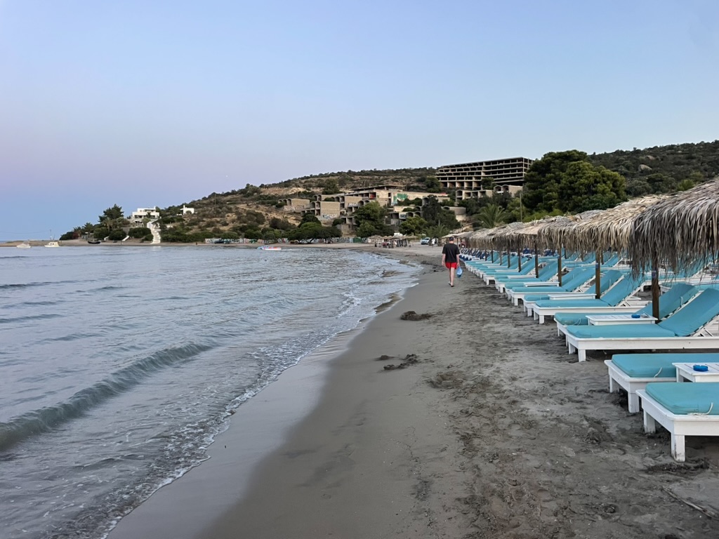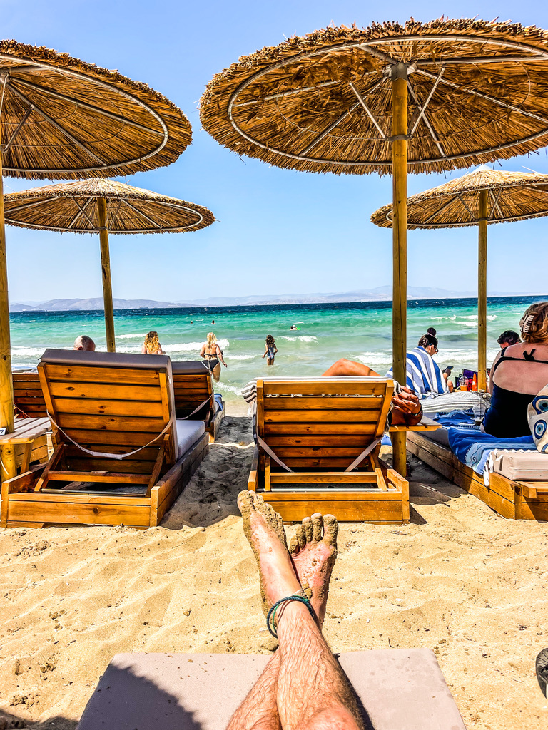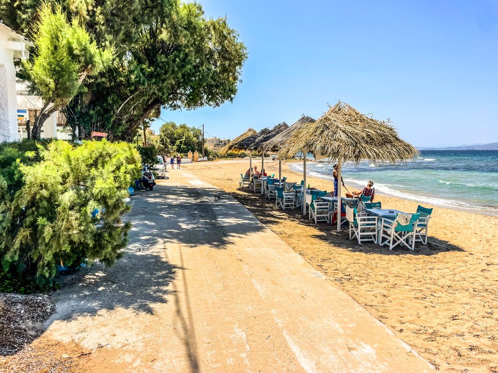 Marathonas beach – 50 cc is voor een Griekse scooter meer dan zat – Aegina is niet groot en snelheid past haar niet – er is weinig verkeer op de weg – de spichtige katten die hier wonen gebruiken het asfalt ook , alleen om te languit te chillen- vanaf Marathonas beach kijk je fijn vanaf je strandbed over de baai naar het herten eilandje Moni- de ober is hier fijn alert (die gozer komt er wel ) een biertje voor meneer is snel getapt – als je niet beter zou weten staat dit cafe qua looks op Ibiza of Bali – global social media style – je mag er wat van vinden , maar tegenhouden doe je het niet -proost.