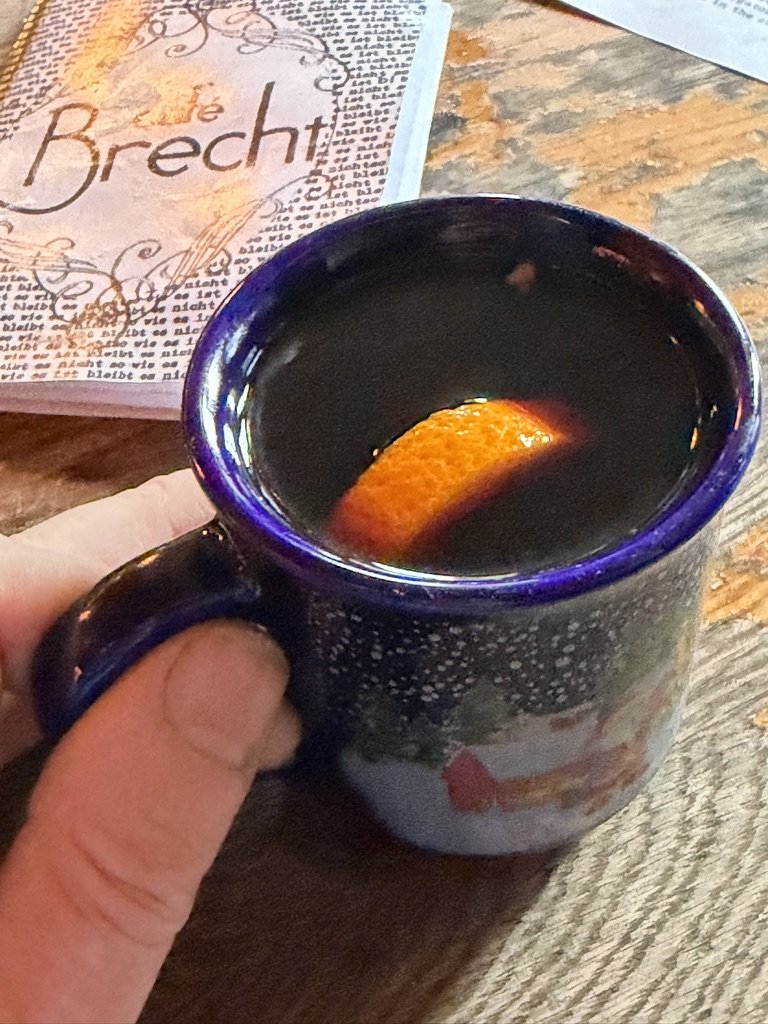 Wat ook erg tof is: Café Brecht is duurzaam. Voor het transport gebruiken ze een Hollandse bakfiets, ze kopen apparaten die reparabel zijn en alle stoelen, tafels en banken komen van de kringloop. Dat geldt ook voor het merendeel van het servies; je krijgt je glühwein altijd in een andere mok of kop, eigenlijk net als bij ons thuis ,als ze bedden hadden gehad dan waren we blijven logeren .